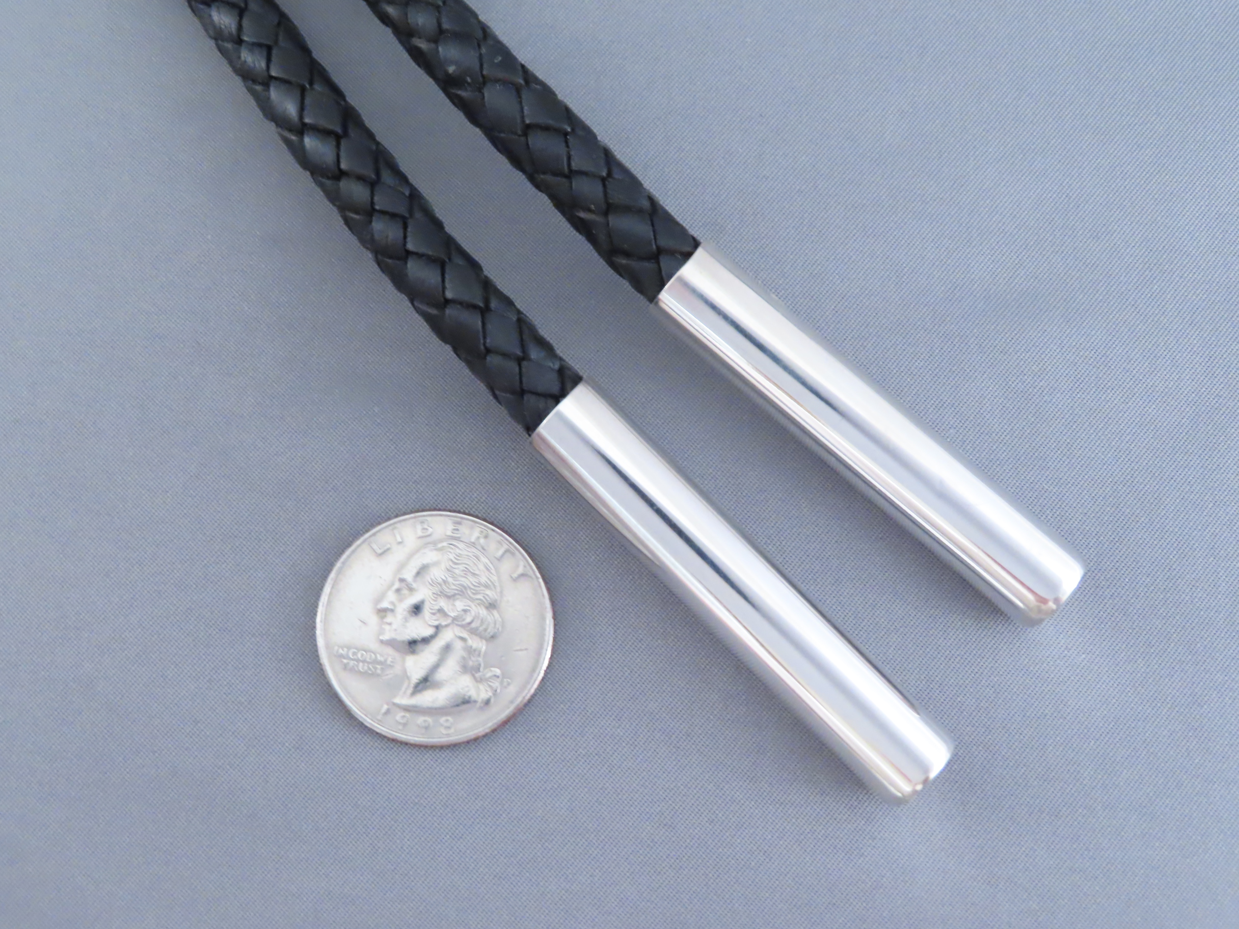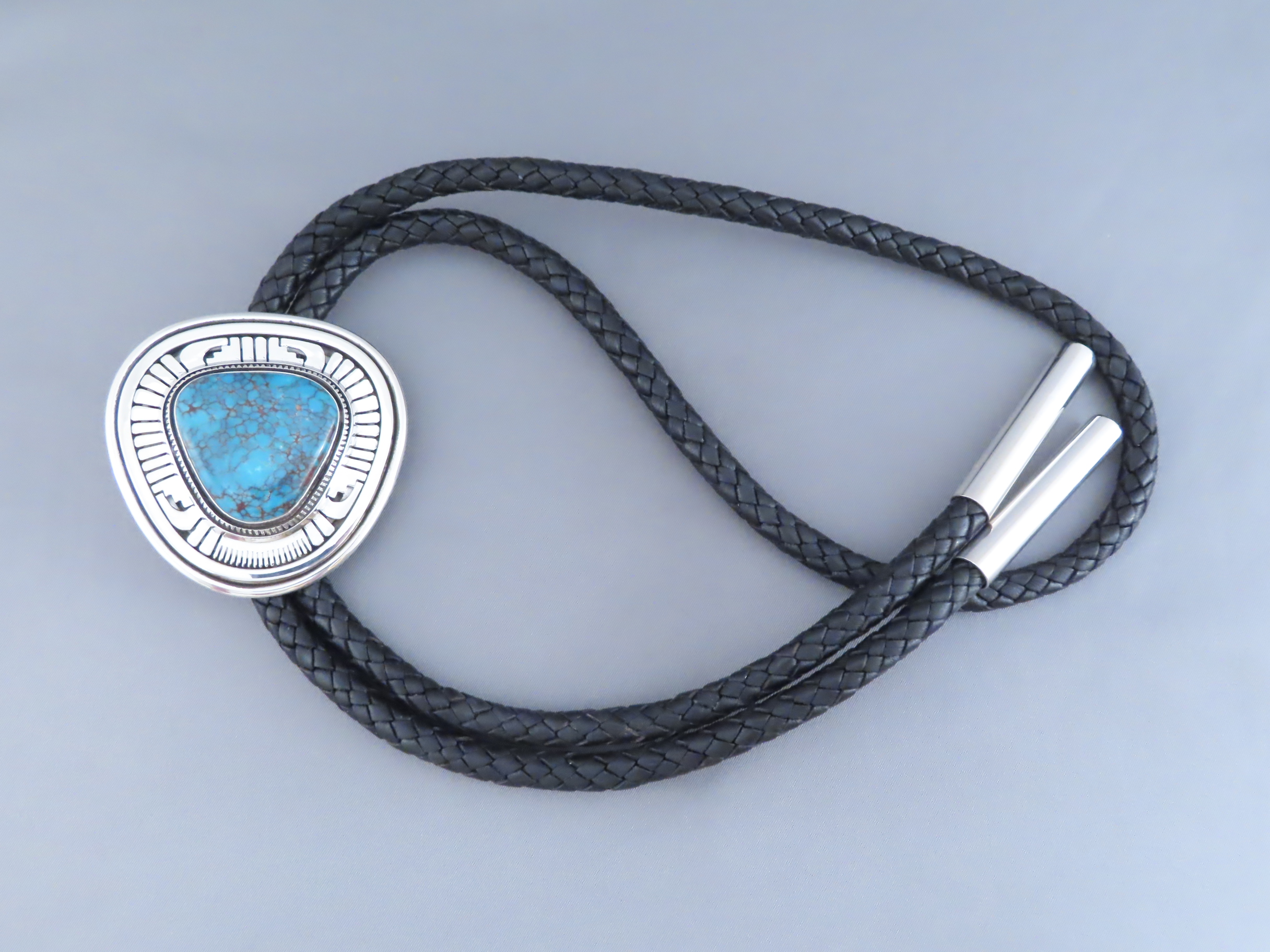 Red Mountain Turquoise Bolo Tie! Large sized bolo tie with an exceptional turquoise centerpiece stone from the depleted Red Mountain mine. Made by Native American jewelry artist, Leonard Nez (Navajo). Bolo comes with 43″ hand-braided black leather tie with sterling silver tips. Rare unique stone! Vibrant with tight webbing.