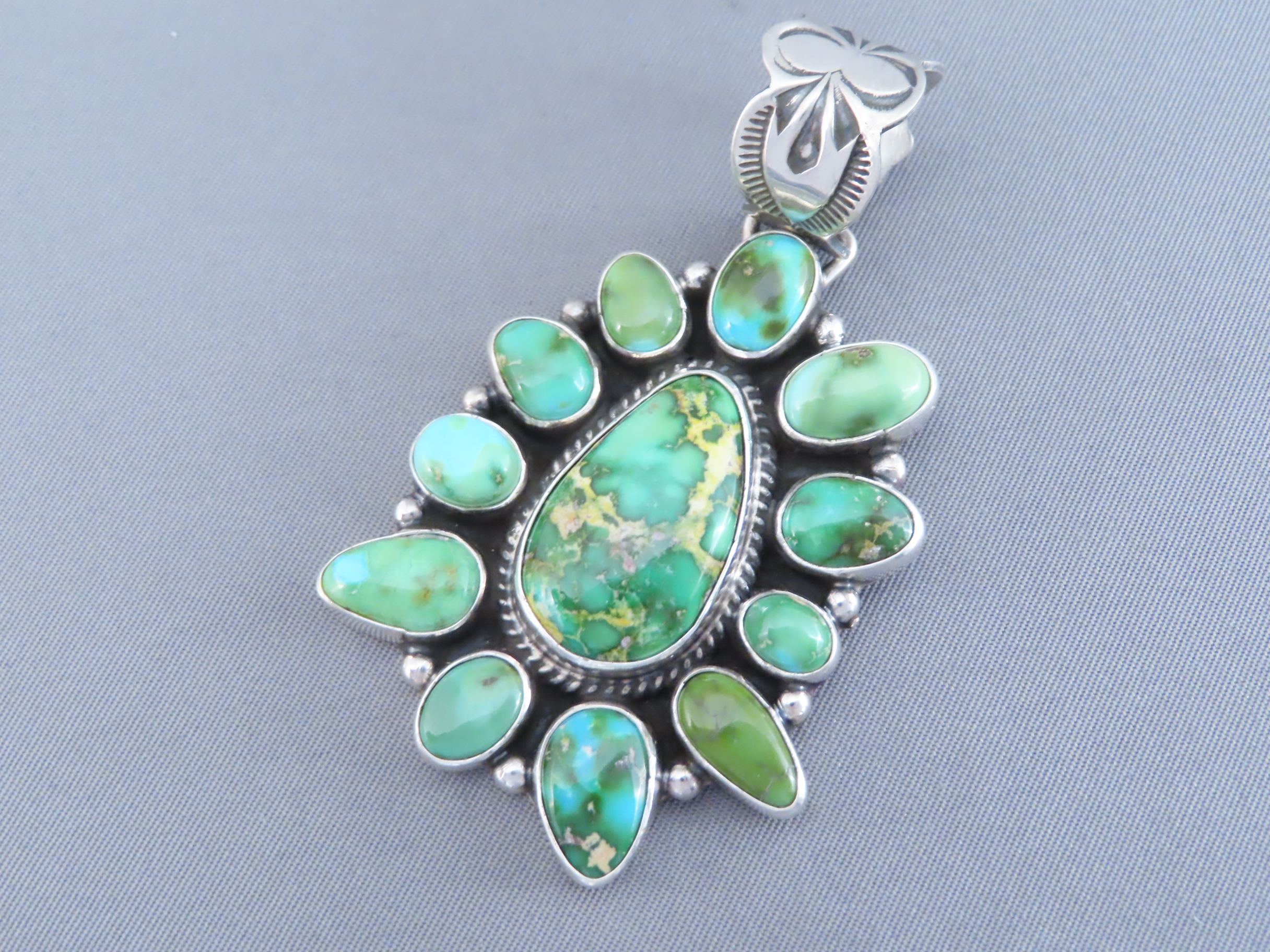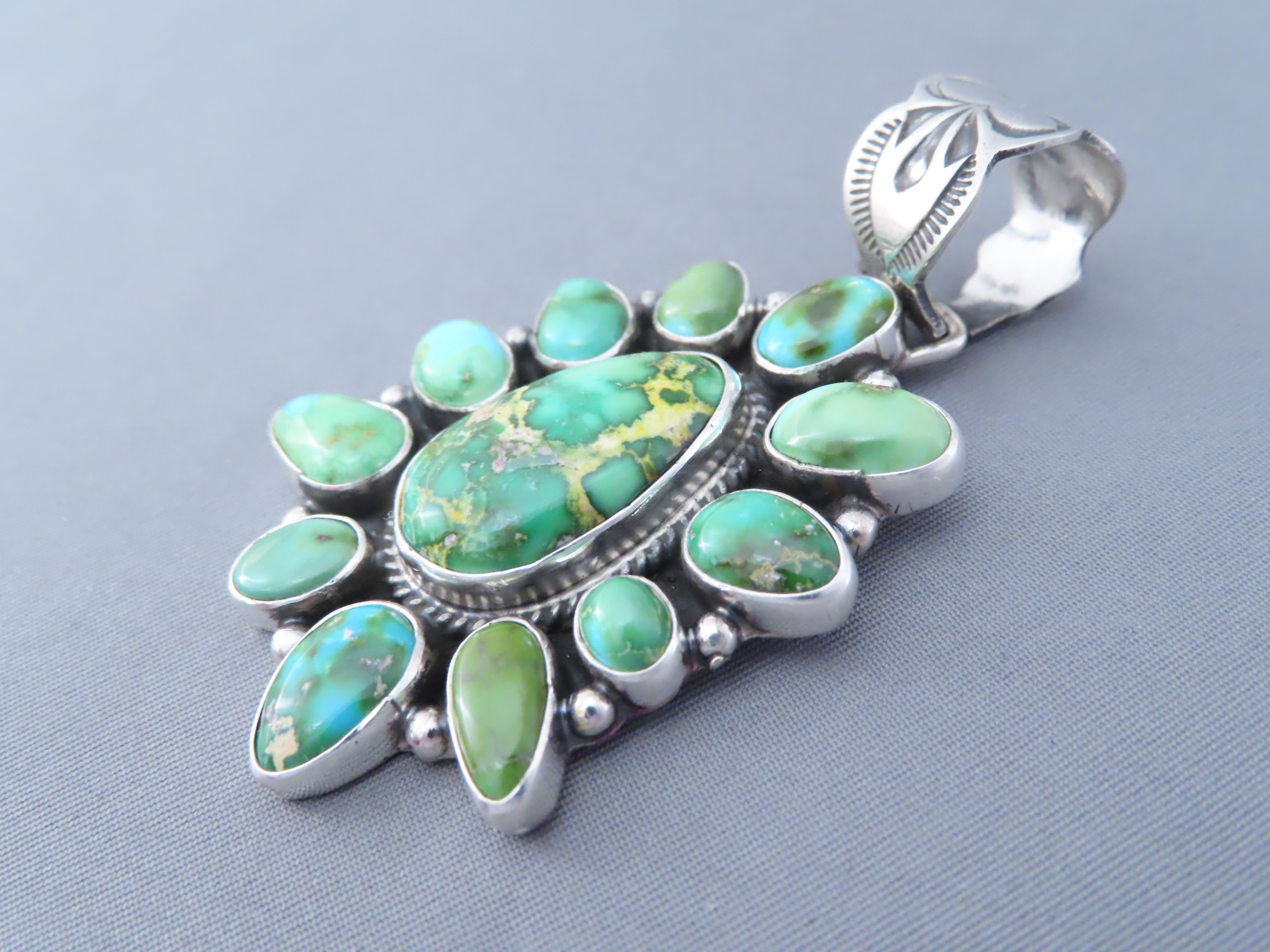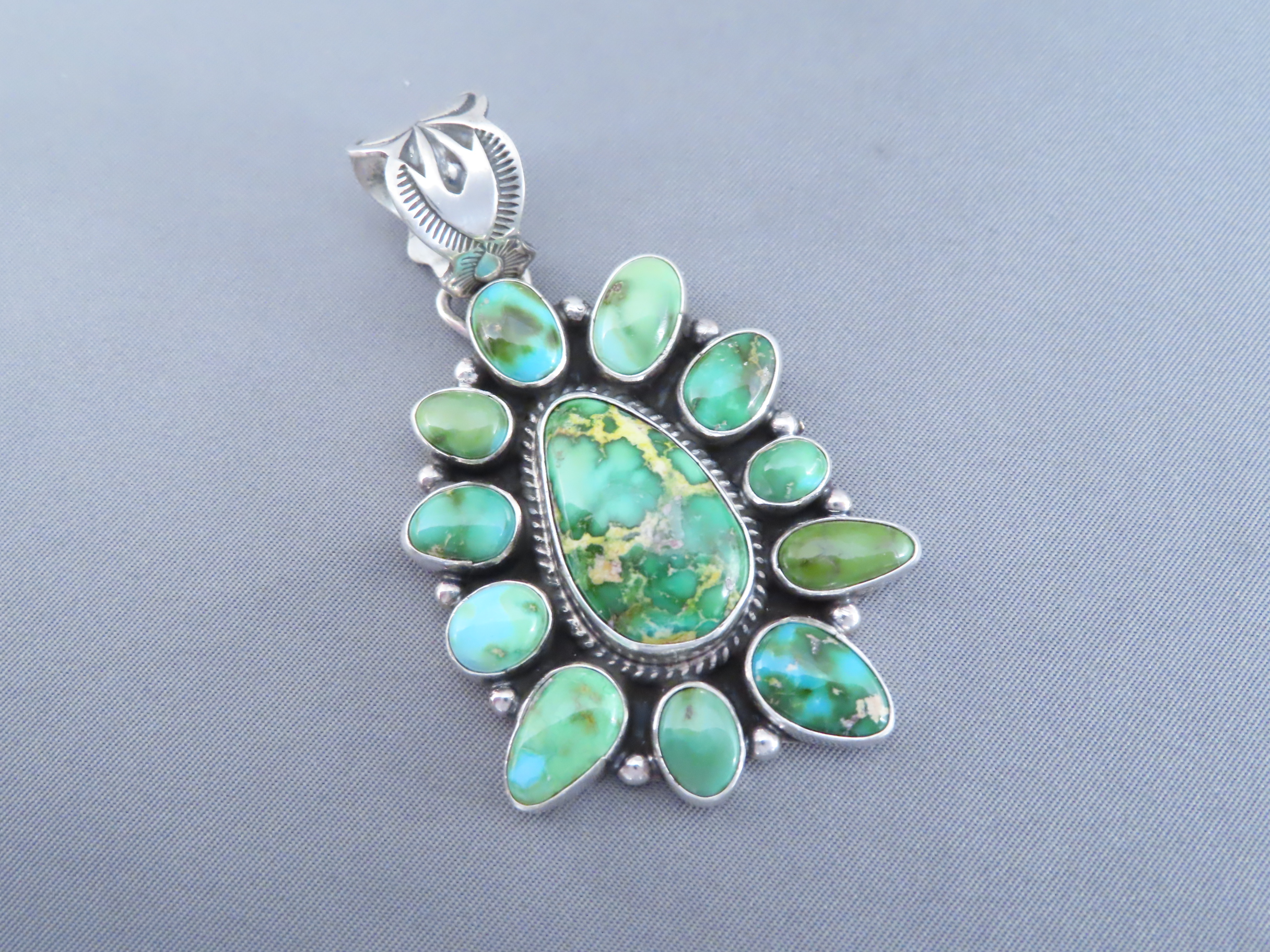 Lovely Sonoran Gold Turquoise Pendant! Pretty turquoise pendant with a great cluster of green turquoise stones. Made by Native American Indian jewelry artist, Geneva Apachito (Navajo).