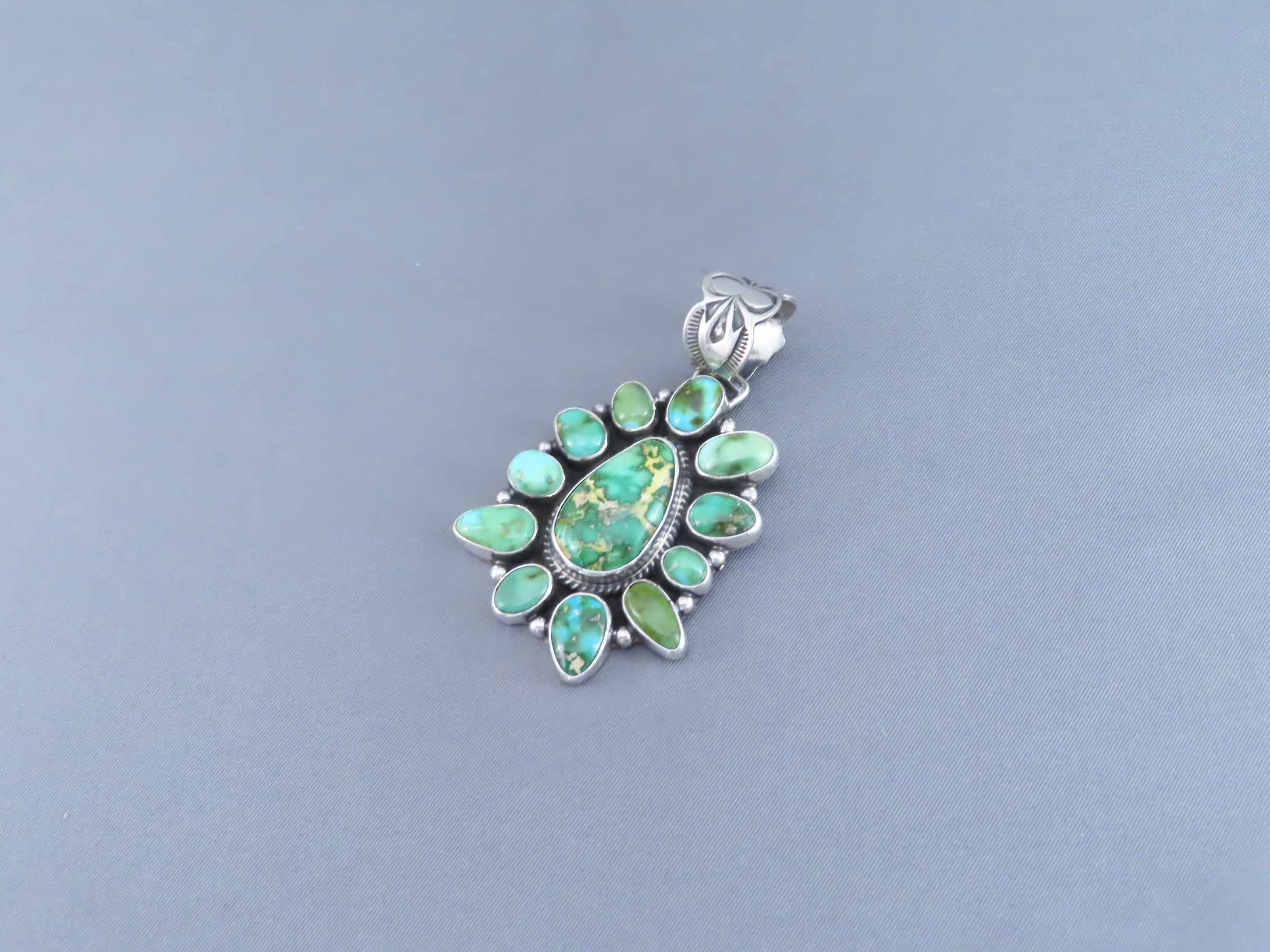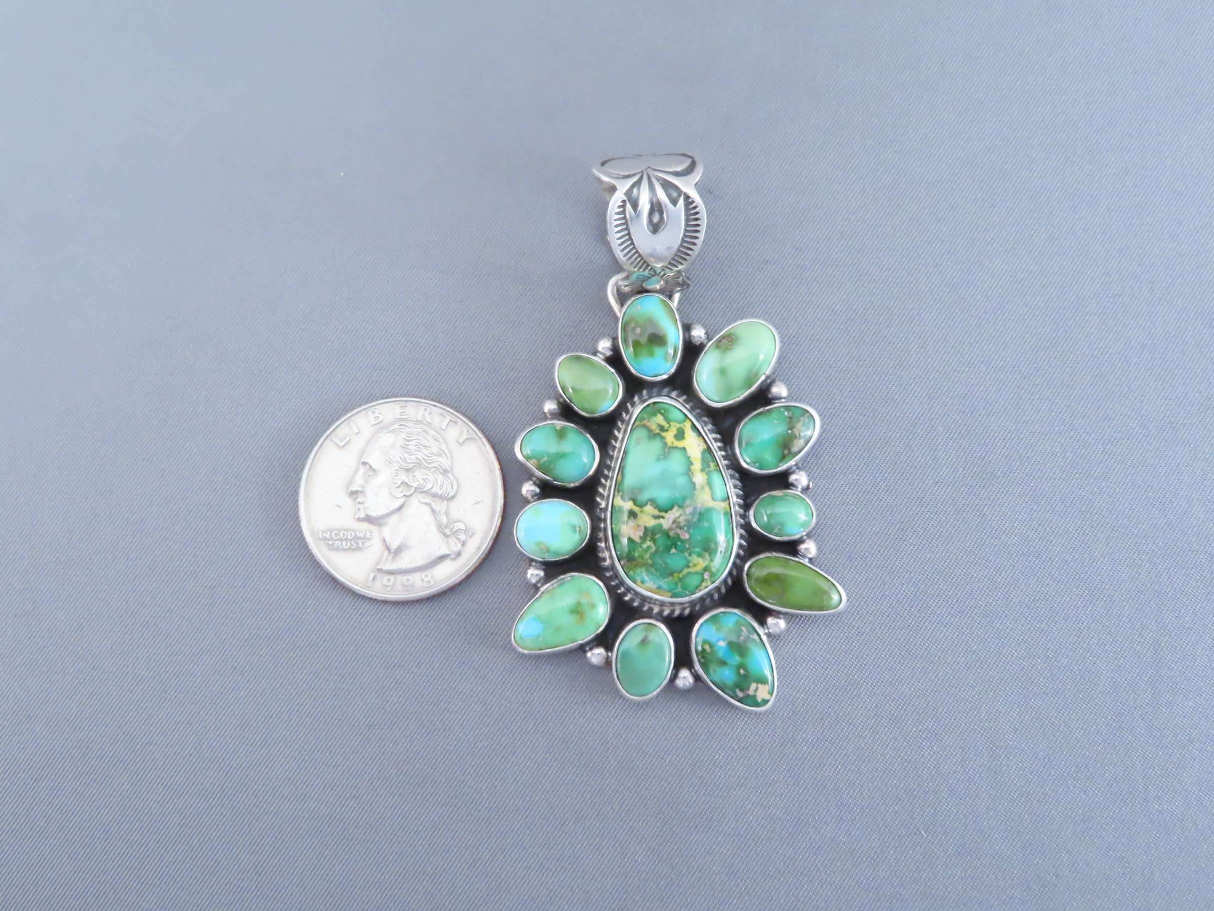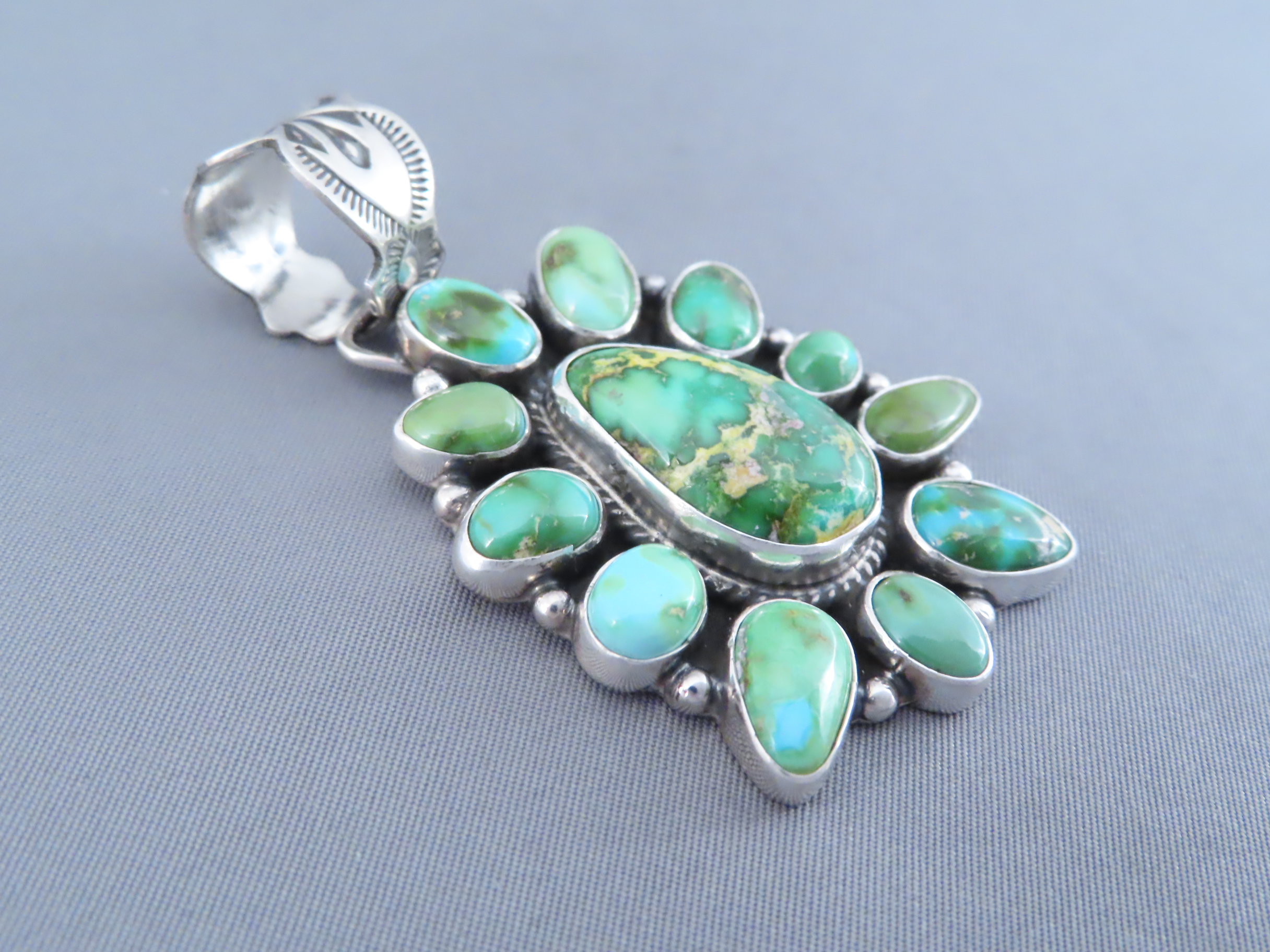 Lovely Sonoran Gold Turquoise Pendant! Pretty turquoise pendant with a great cluster of green turquoise stones. Made by Native American Indian jewelry artist, Geneva Apachito (Navajo).
