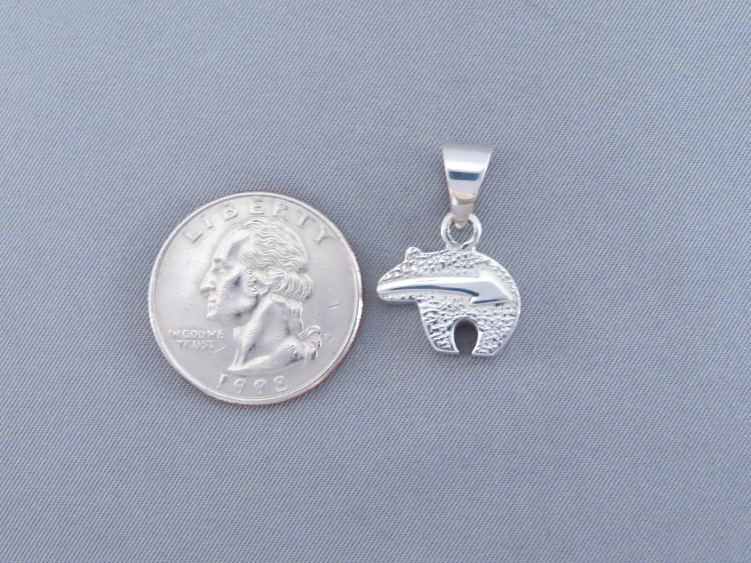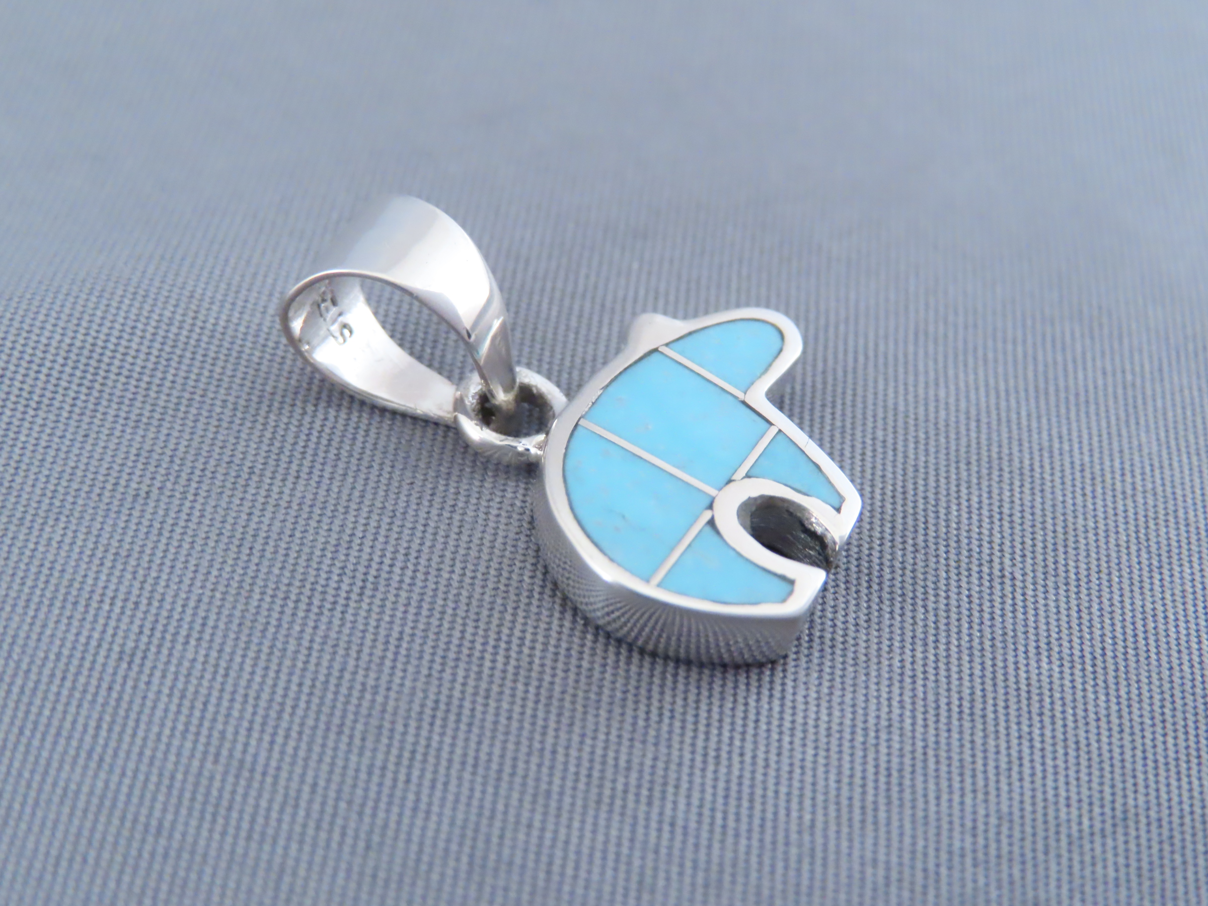 This small sterling silver Bear-shaped pendant features beautifully inlaid Turquoise stones. Lovely Navajo Jewelry! Can be worn reversed as a sterling silver bear pendant with heartline.