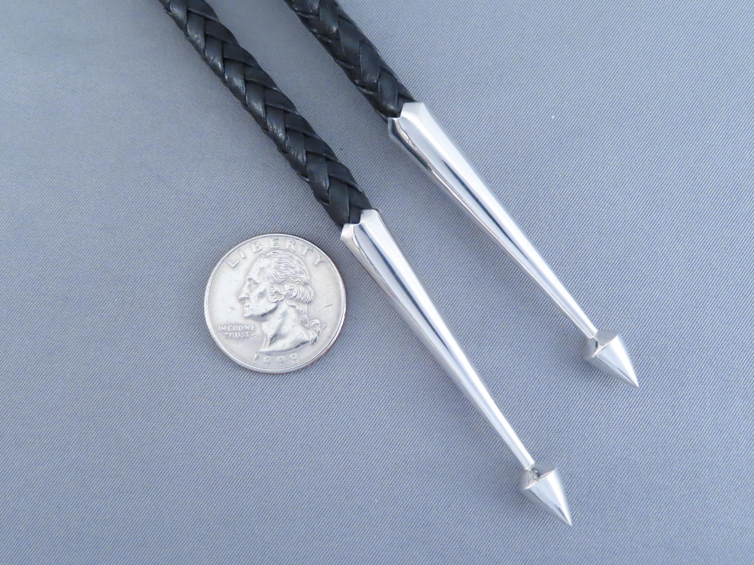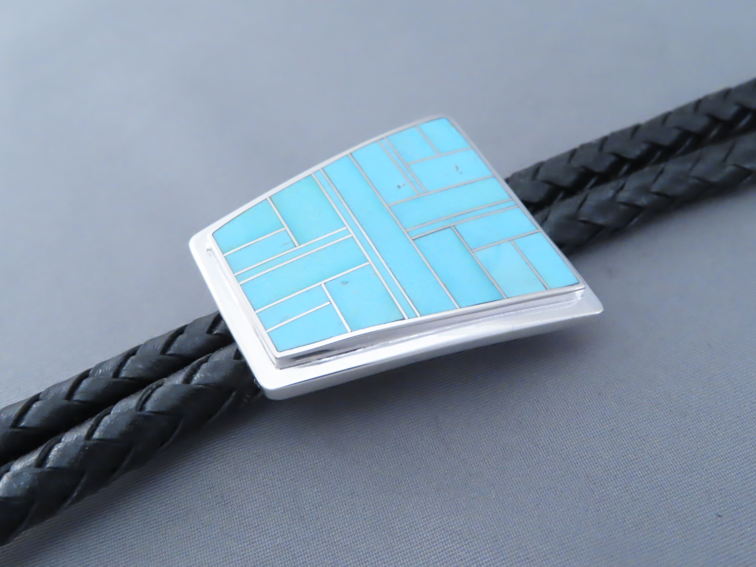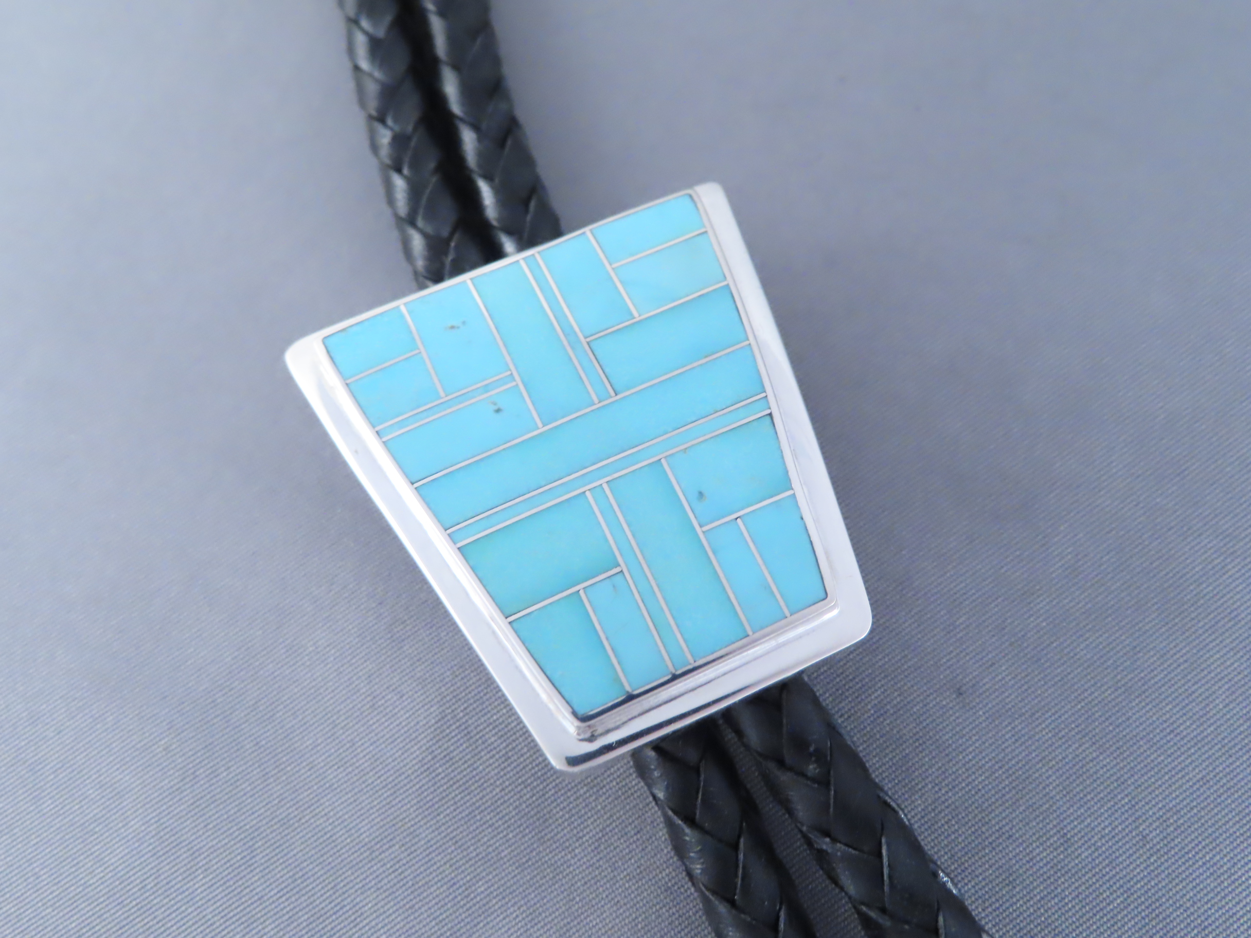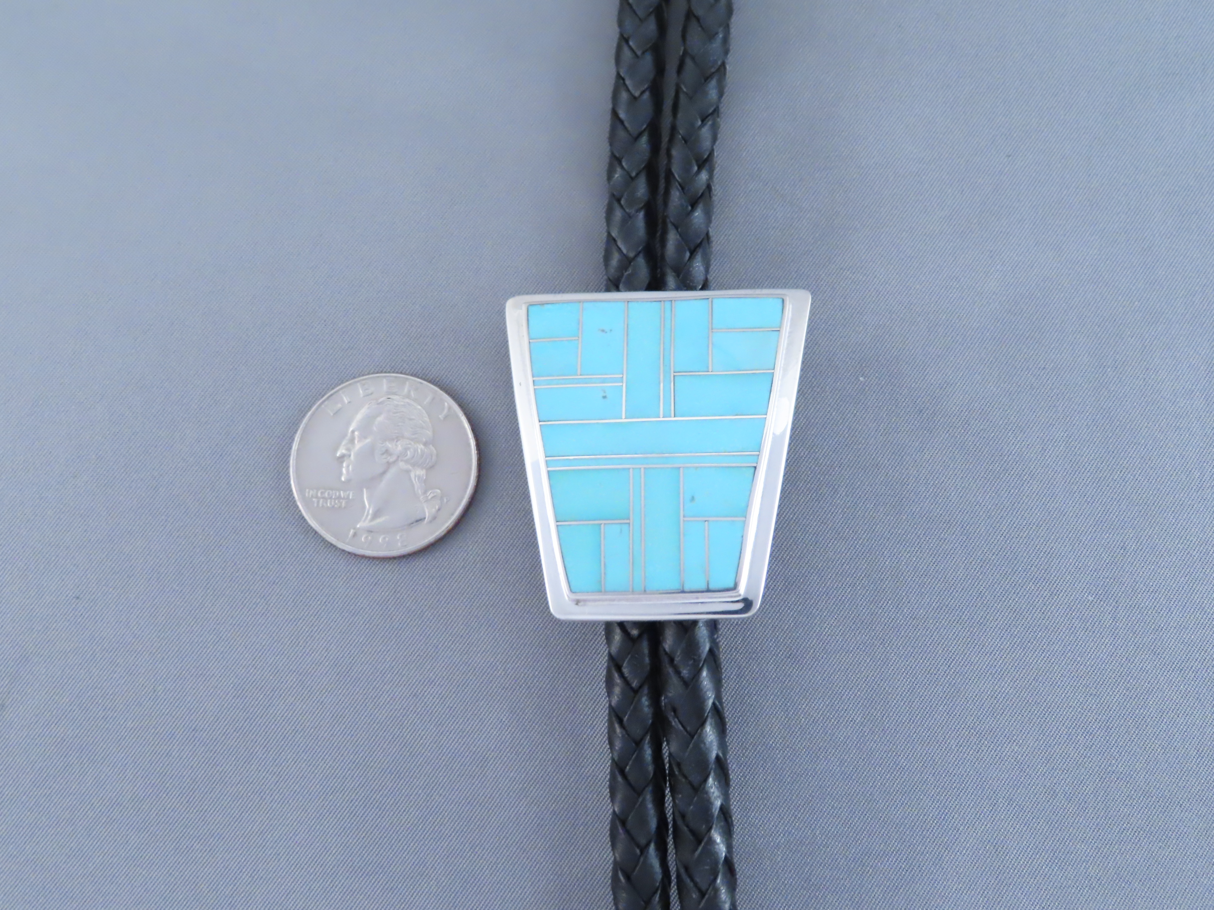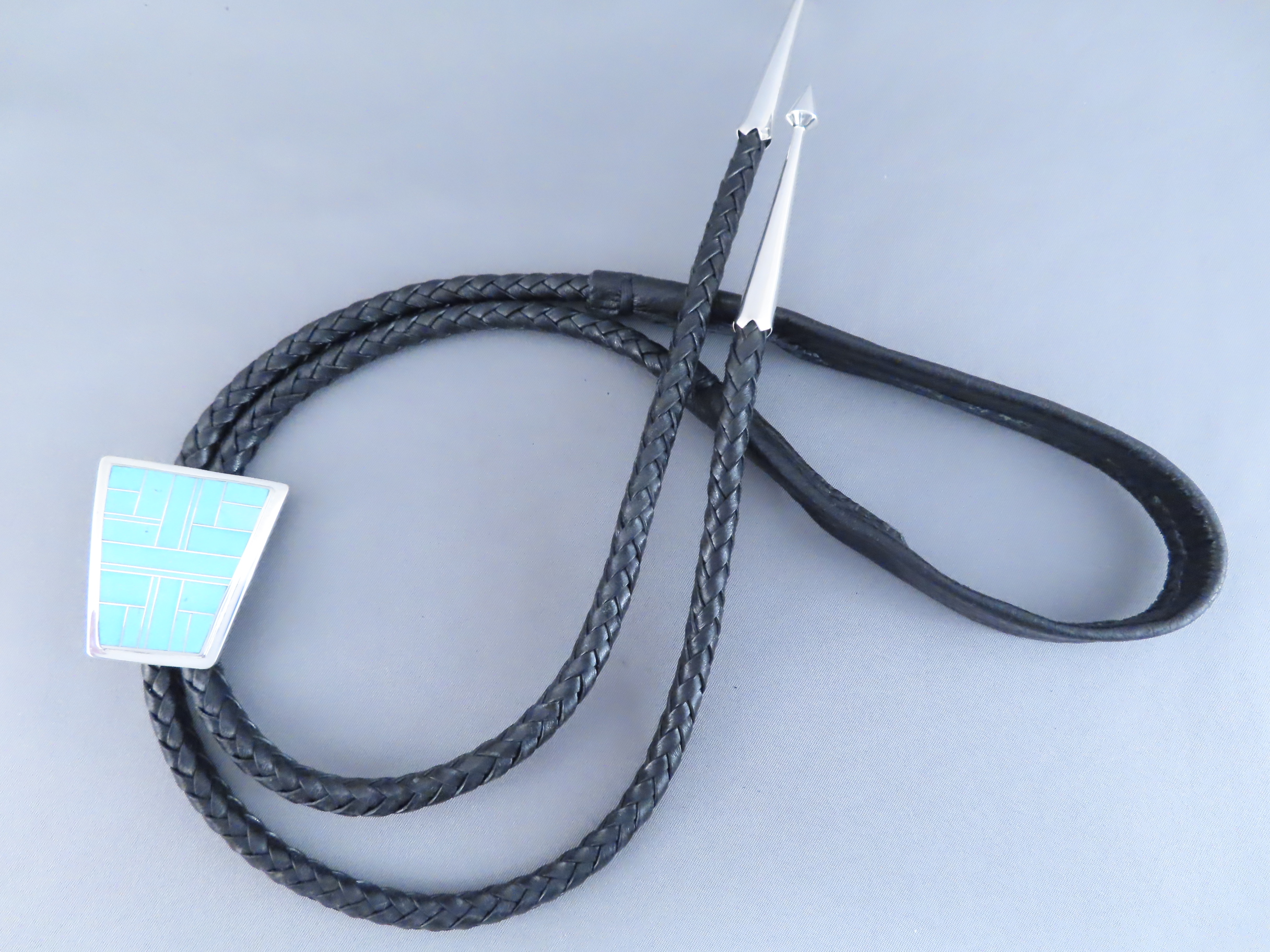 Smaller Turquoise Inlay Bolo Tie! Very attractive sterling silver bolo tie with inlaid Turquoise stones. Beautifully made by Native American (Navajo) jewelry artist, Peterson Chee. Bolo comes with a 45″ braided black leather tie with sterling silver tips.