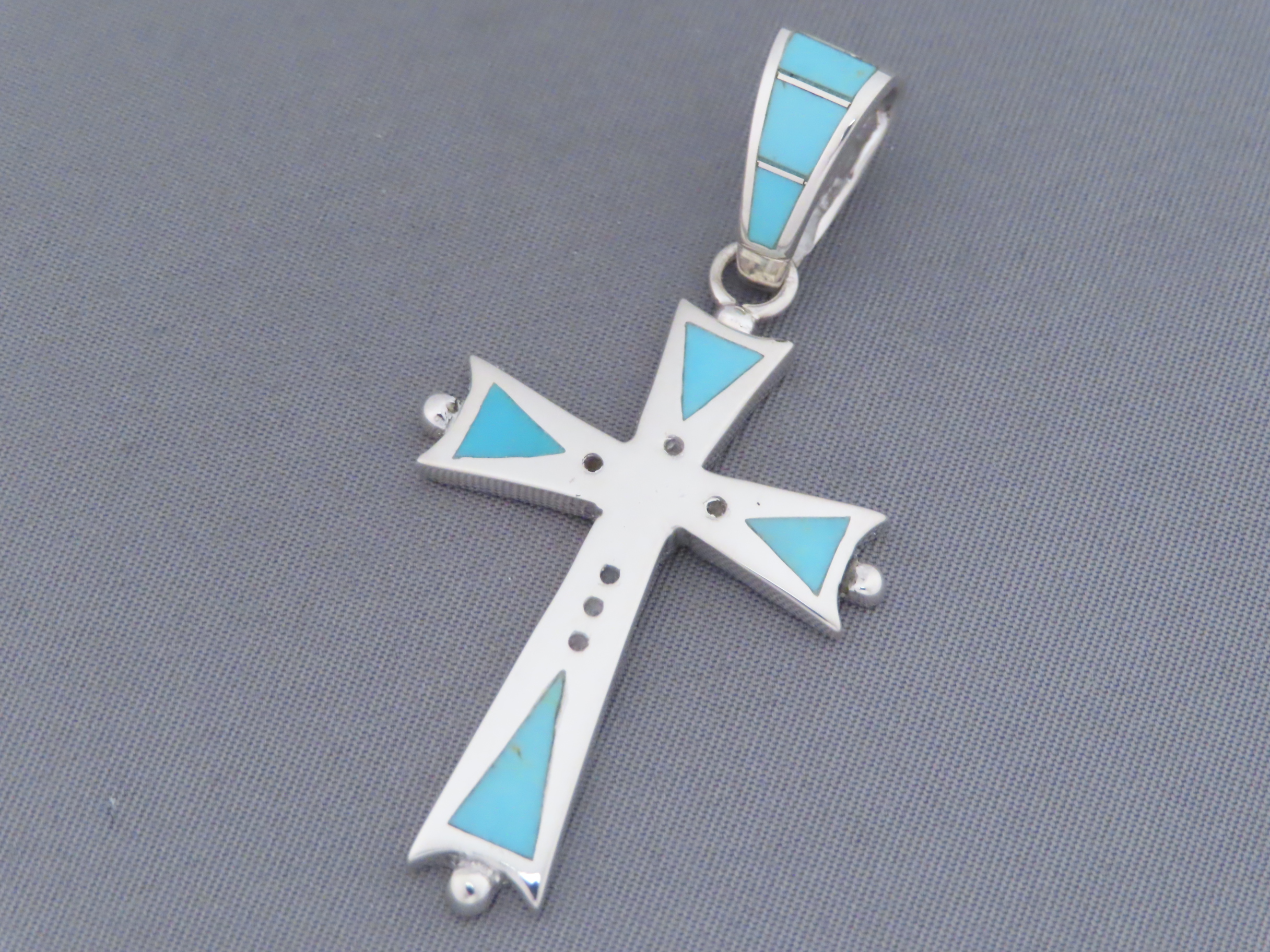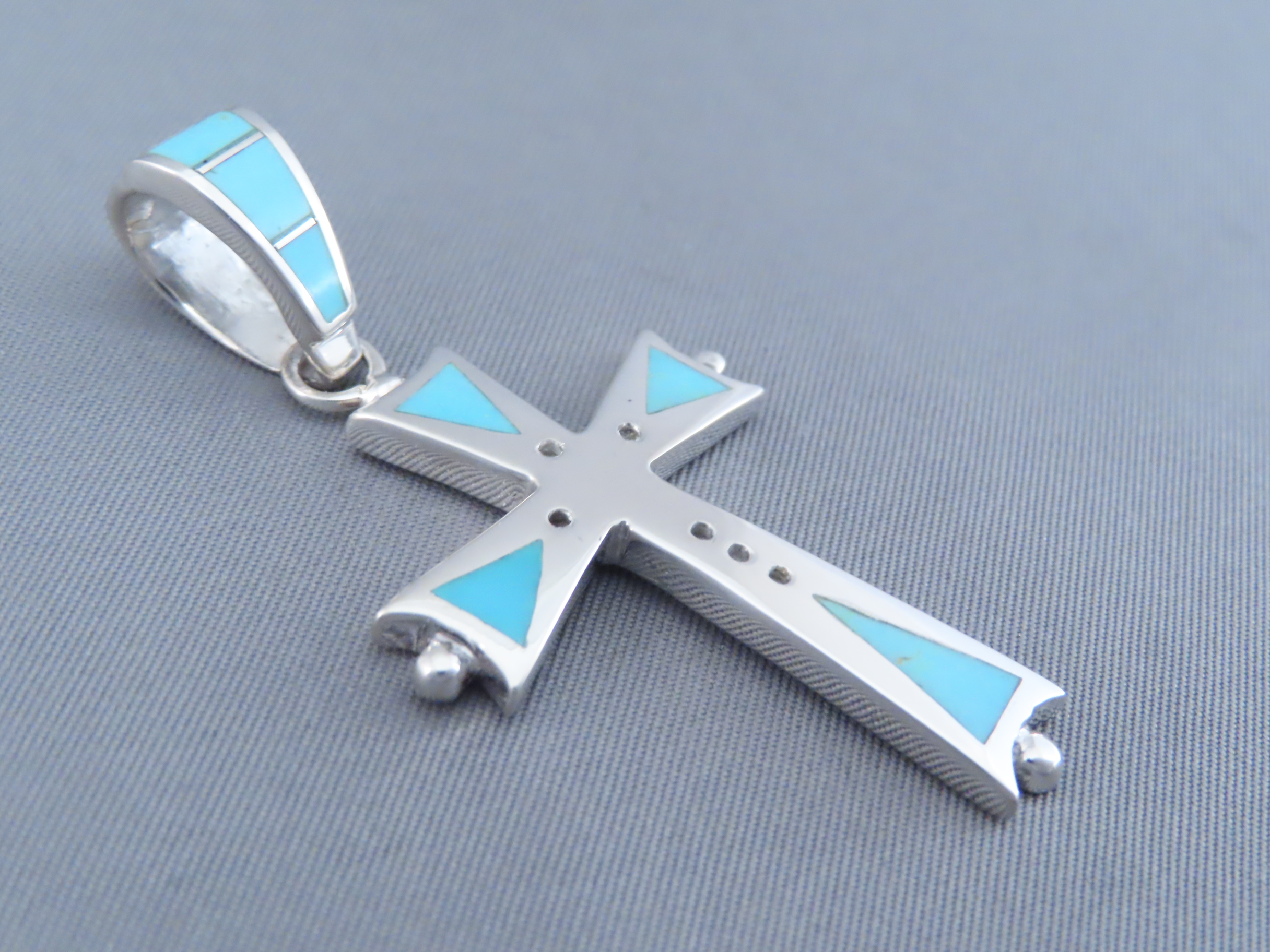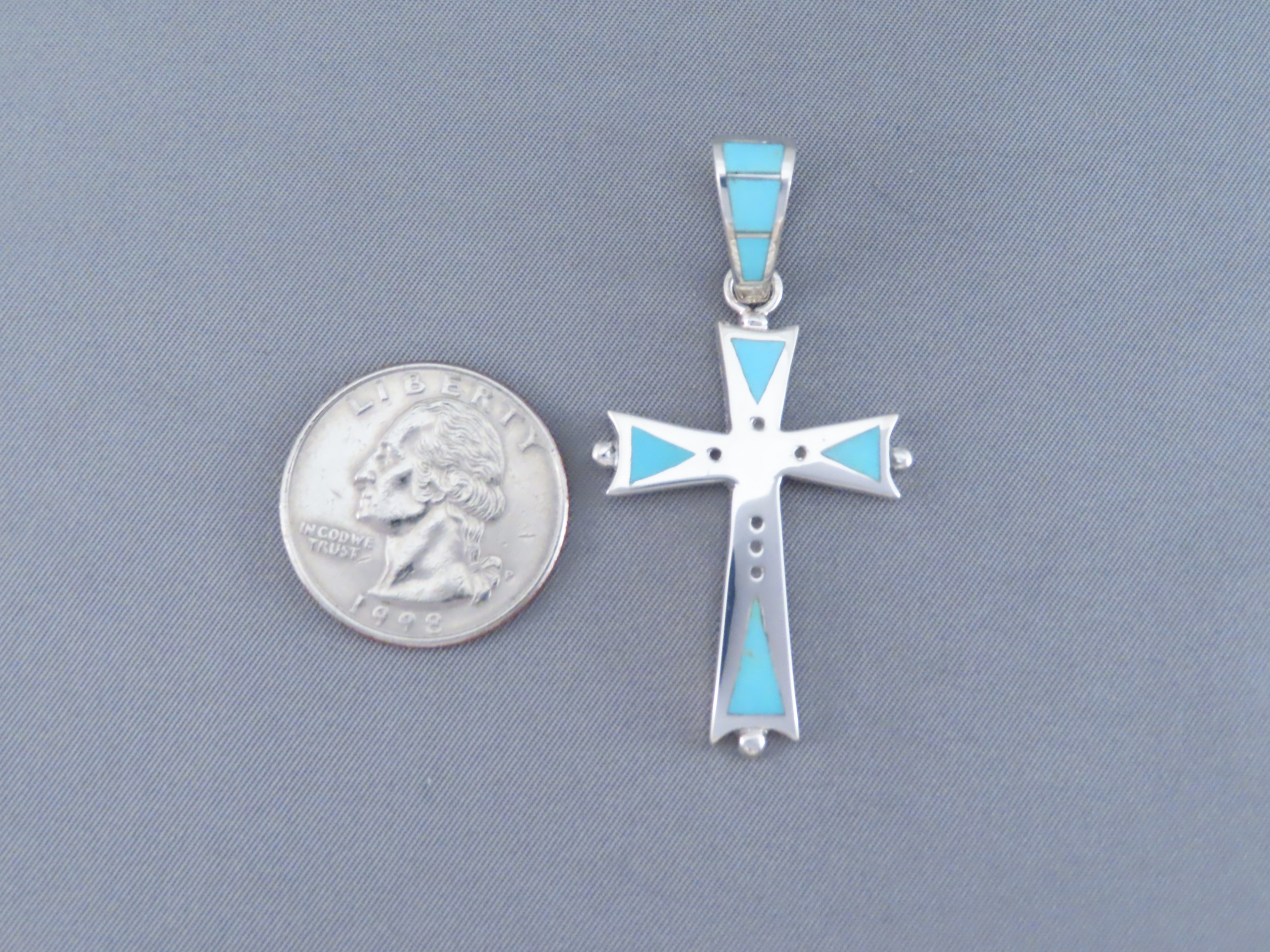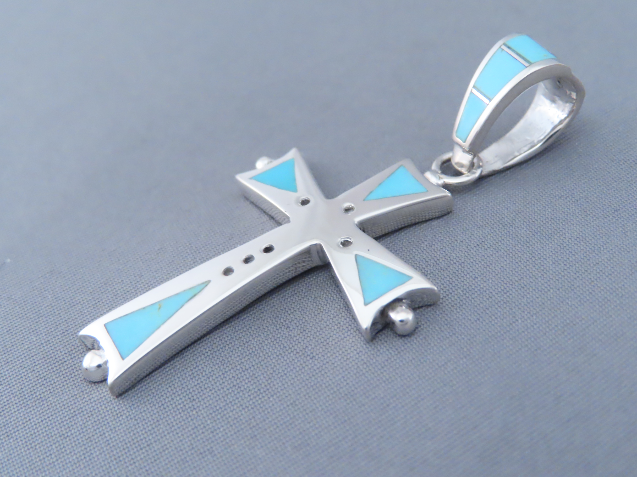 BEAUTIFUL Turquoise Inlay Cross Pendant! Sterling silver cross inlaid with vibrant blue turquoise (including lovely inlay on the bale!). Lovely turquoise cross pendant by Native American jewelry artist, Peterson Chee (Navajo).