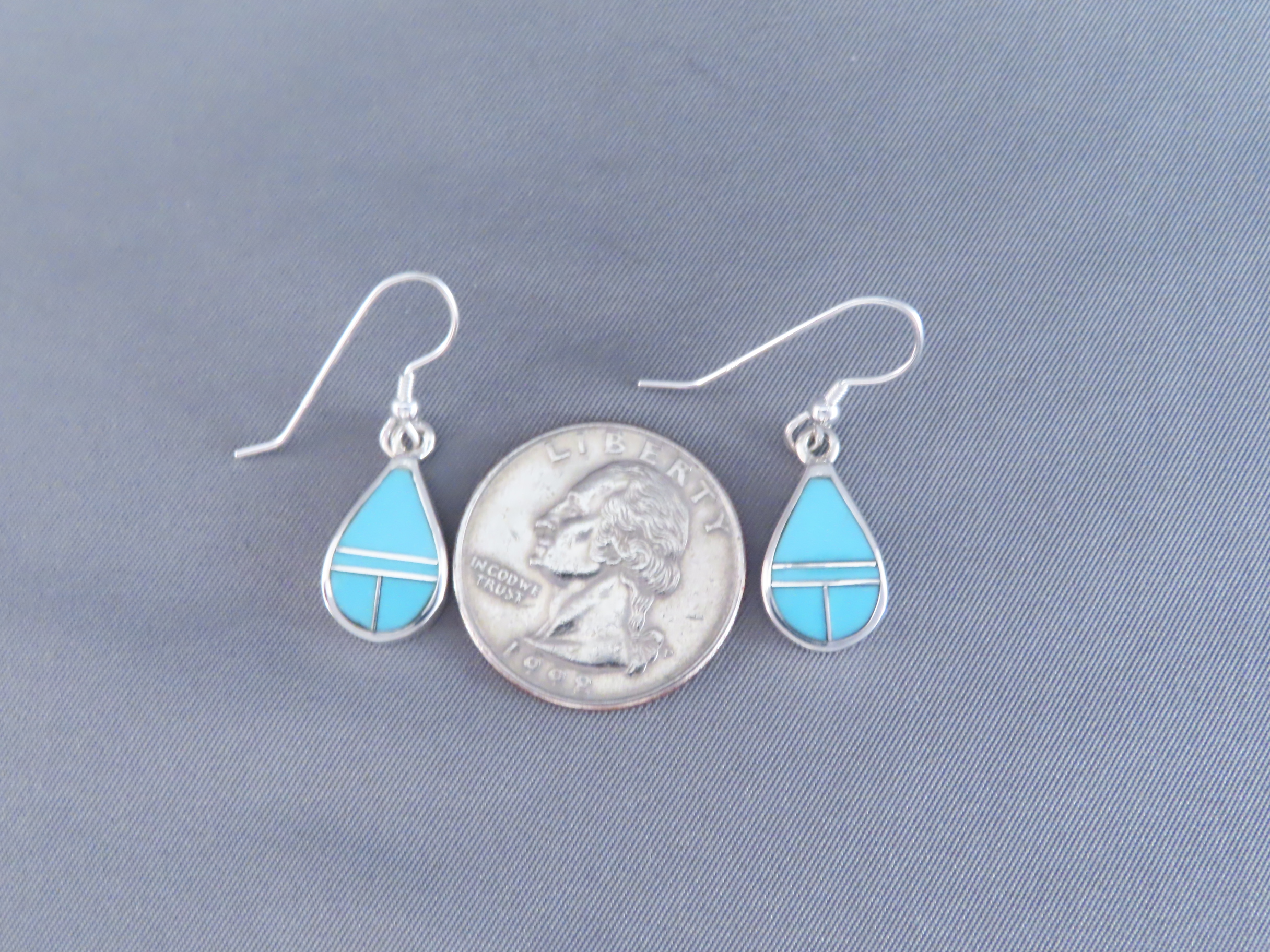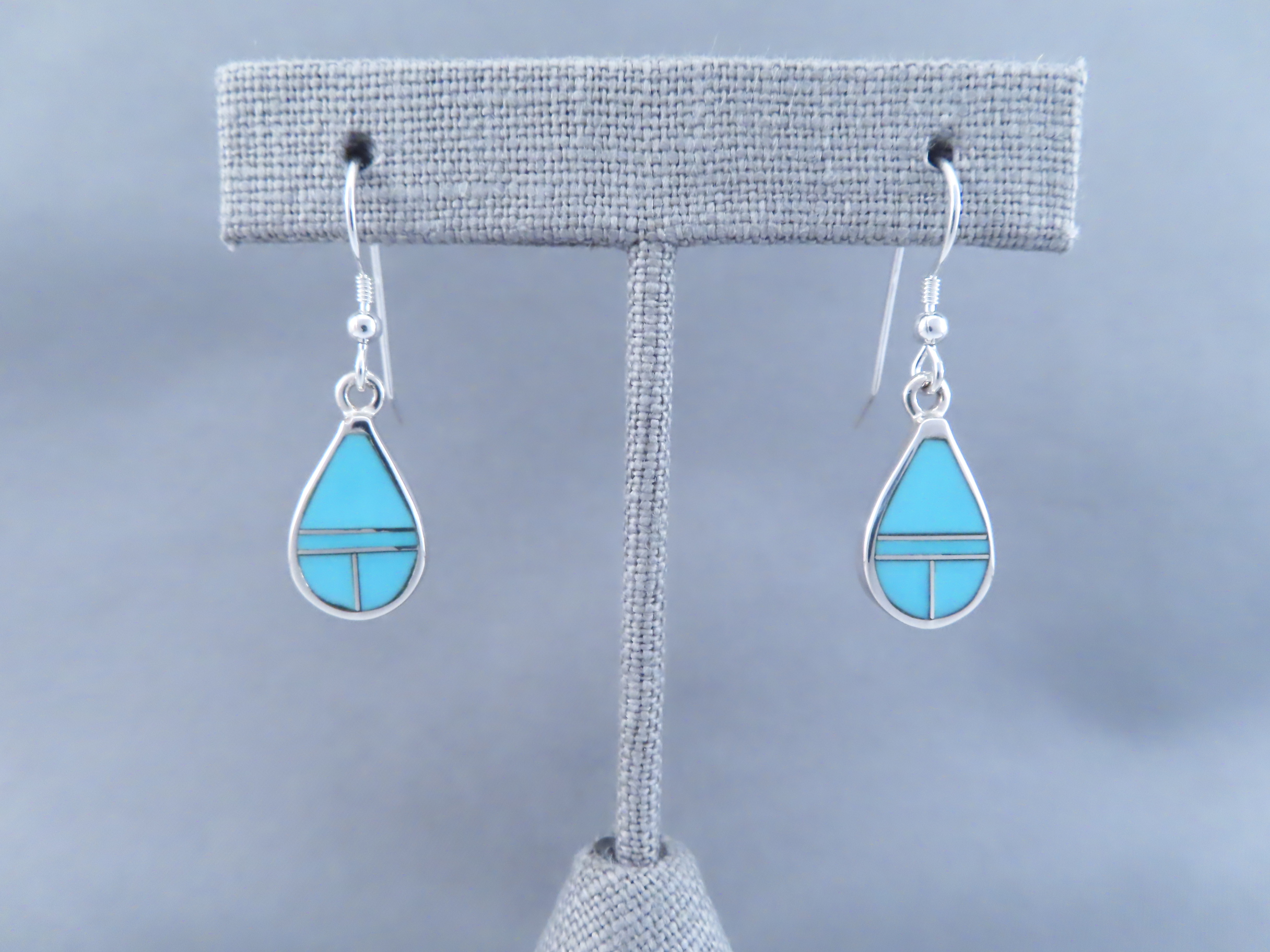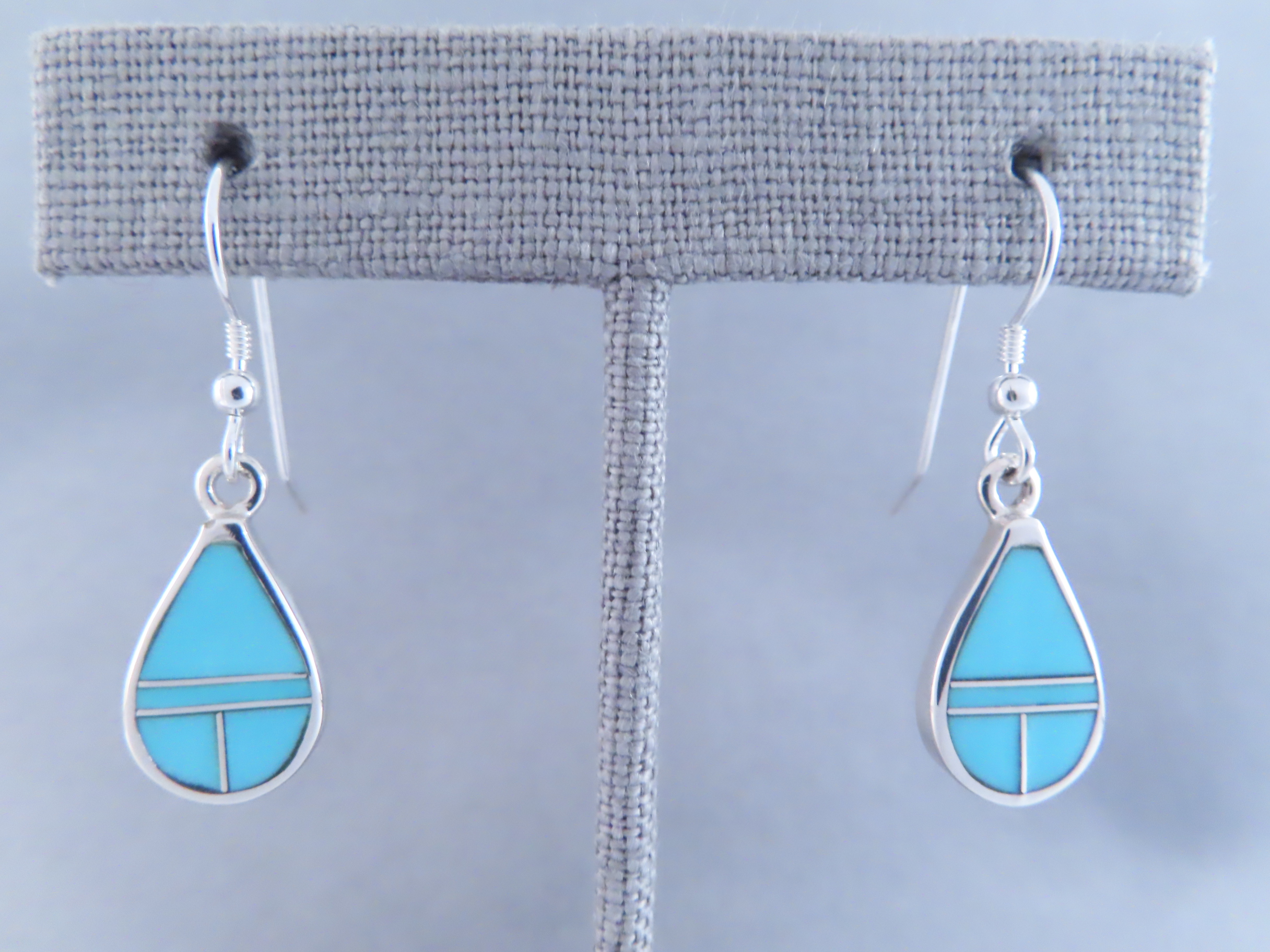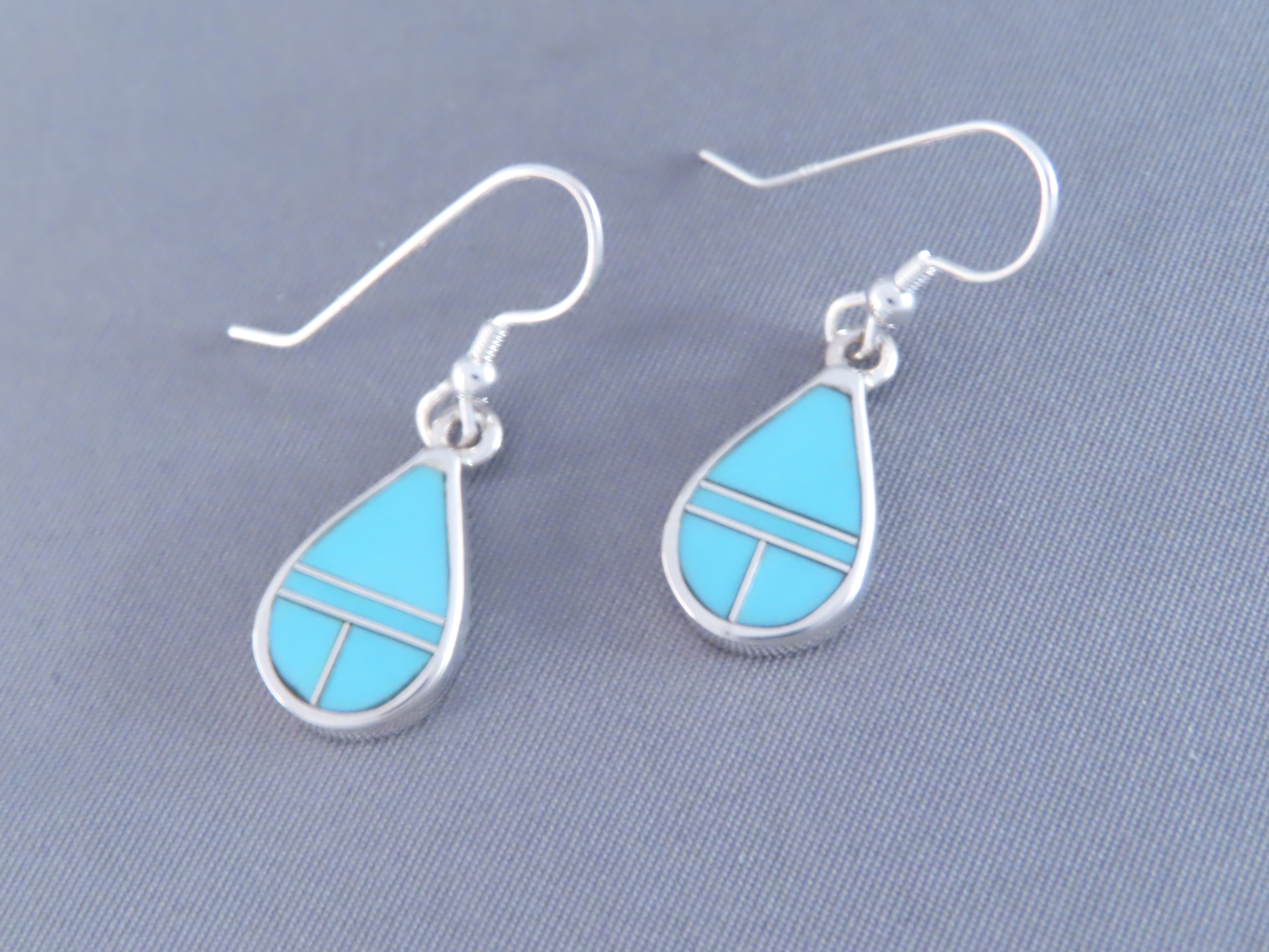 Turquoise Inlay Teardrop Earrings! These beautiful Sterling Silver wire earrings are made with finely inlaid Turquoise stones. Lovely Native American turquoise jewelry made by Navajo Indian artist, Tim Charlie.