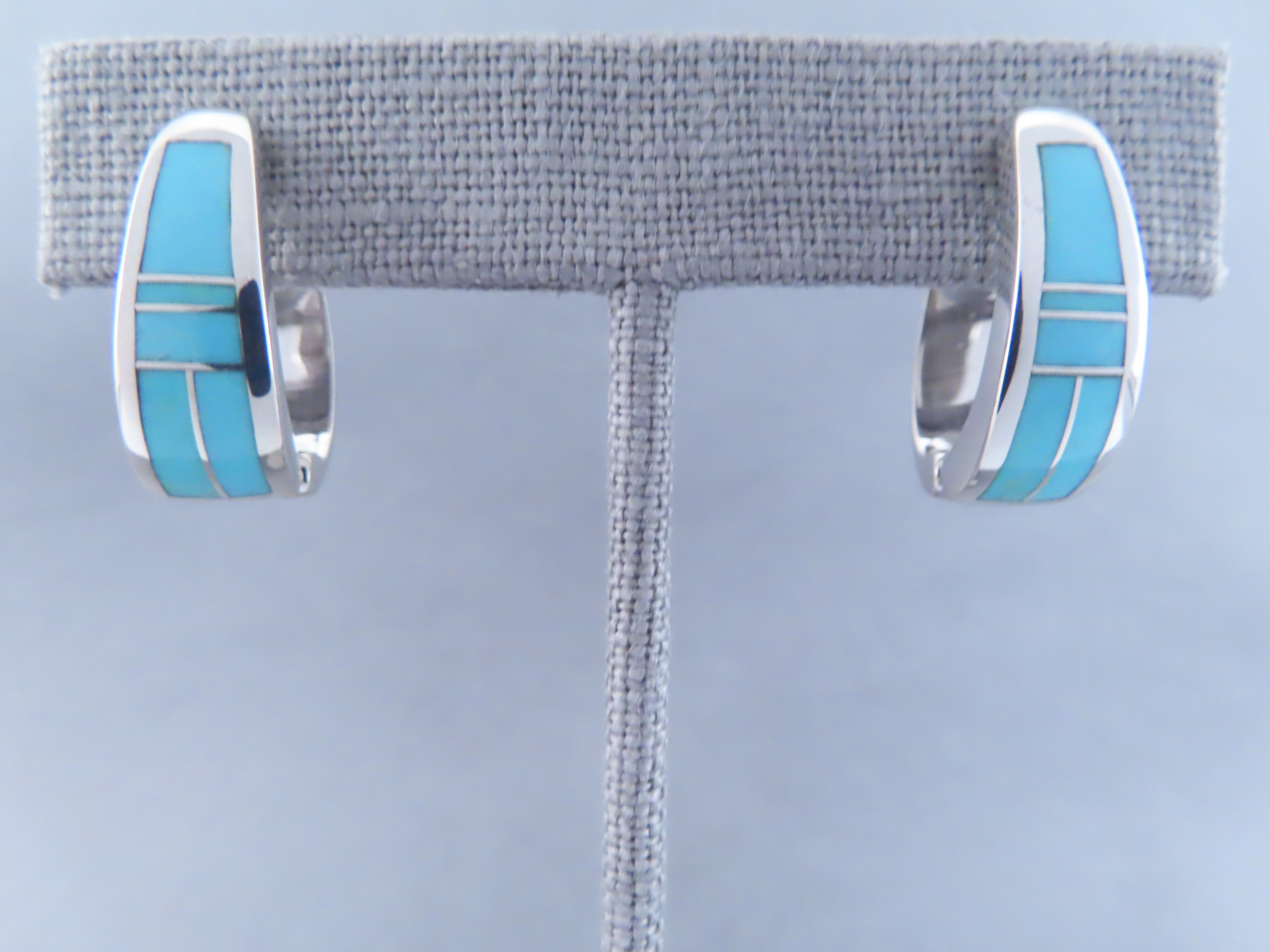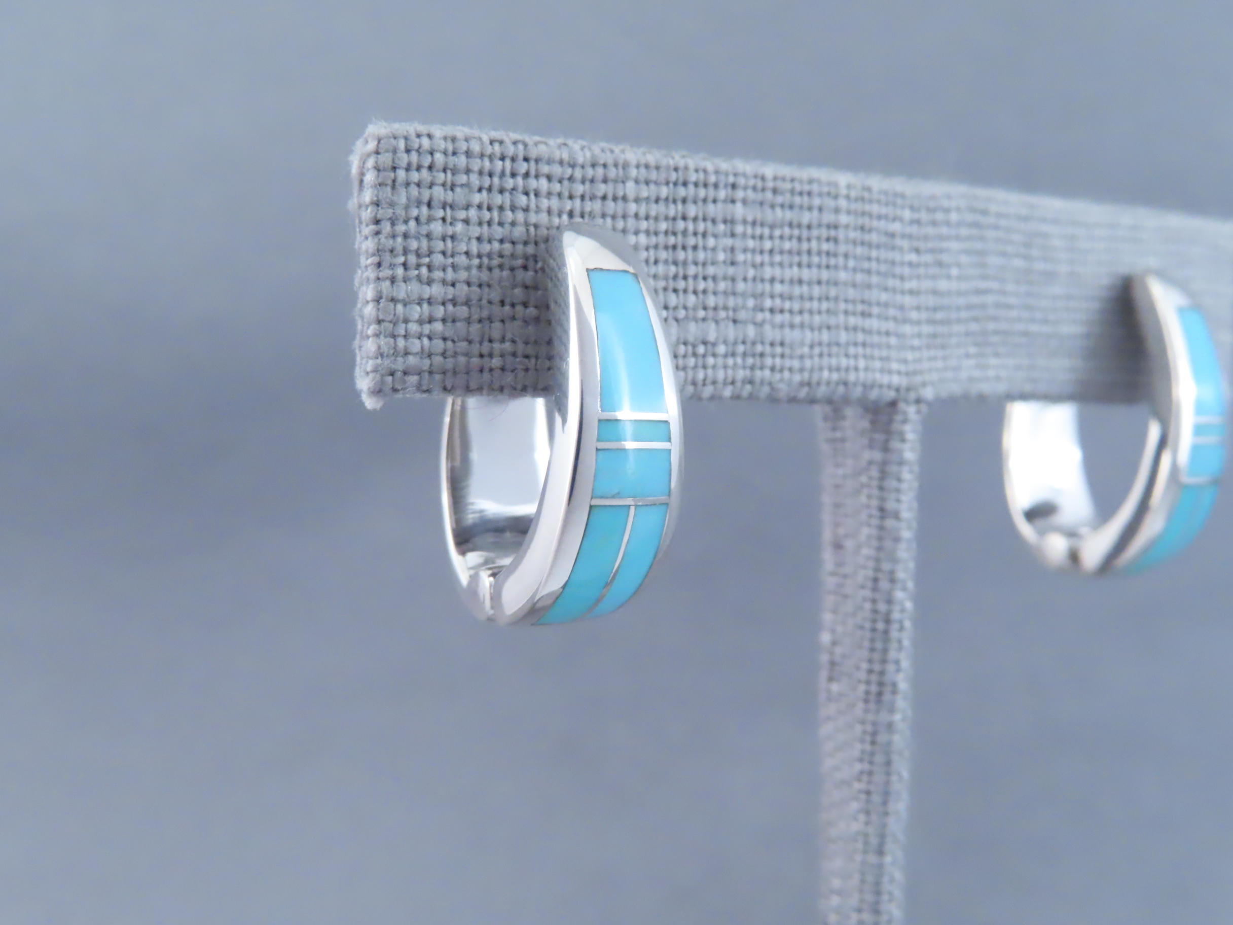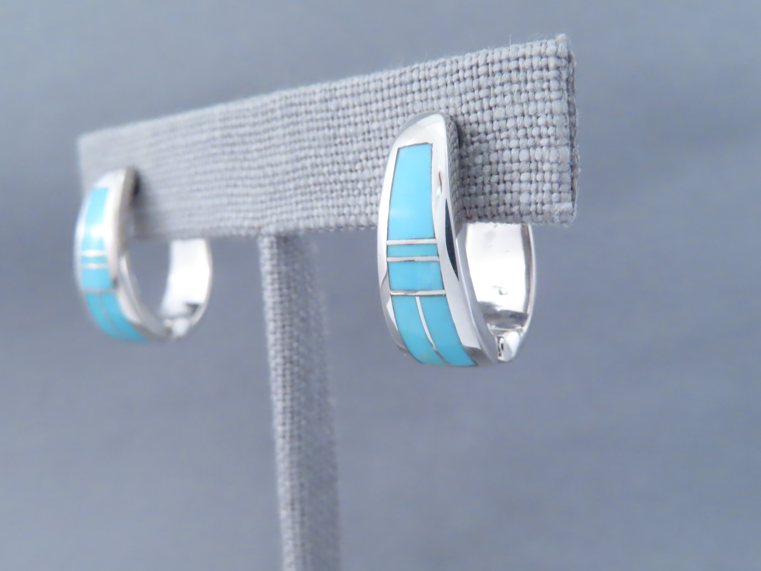 Turquoise Inlay Huggies! Sterling silver inlay lever back post earrings (huggies) featuring finely inlaid Turquoise stones. These lovely inlay earrings were beautifully made by Native American (Navajo) jewelry artist, Charles Willie.