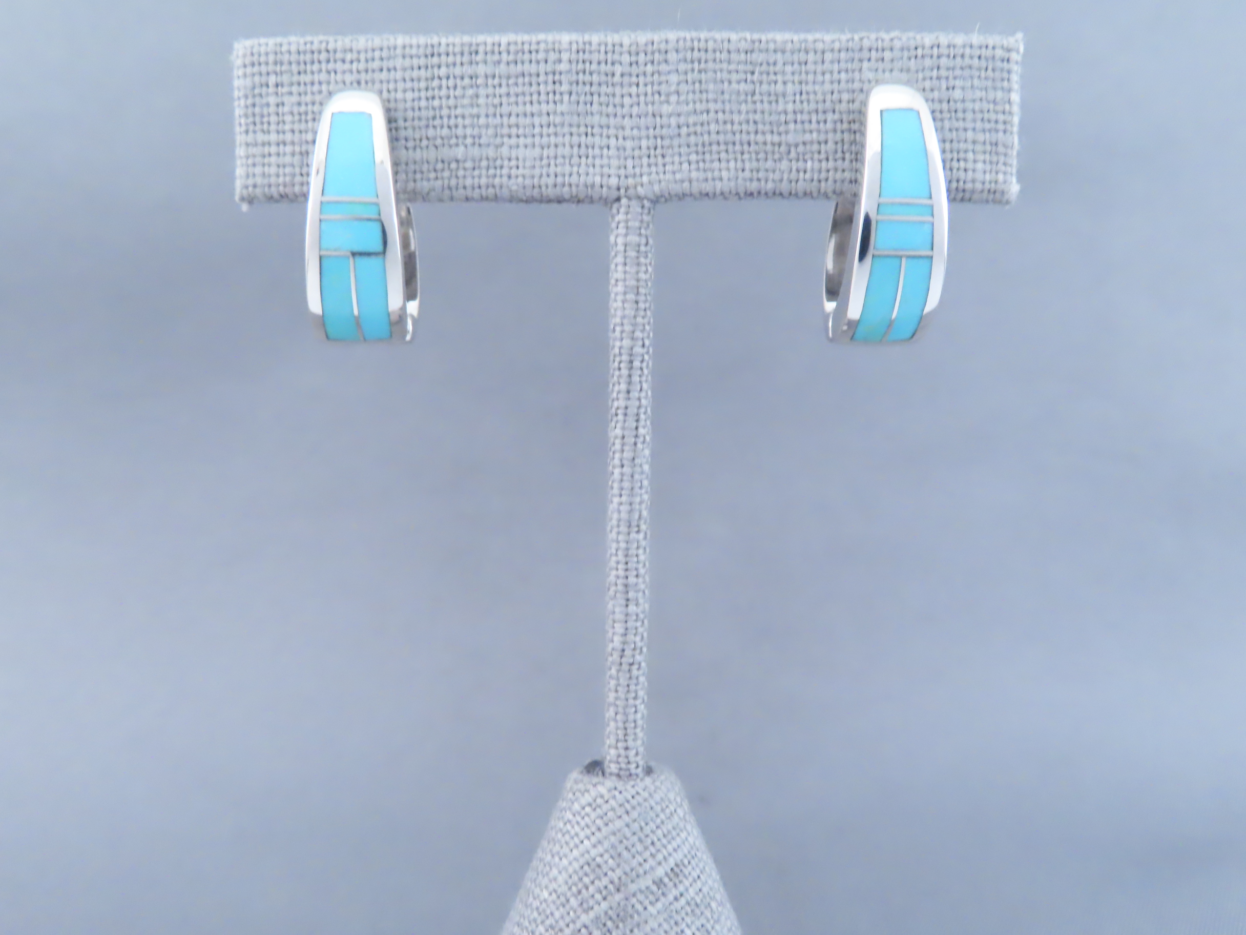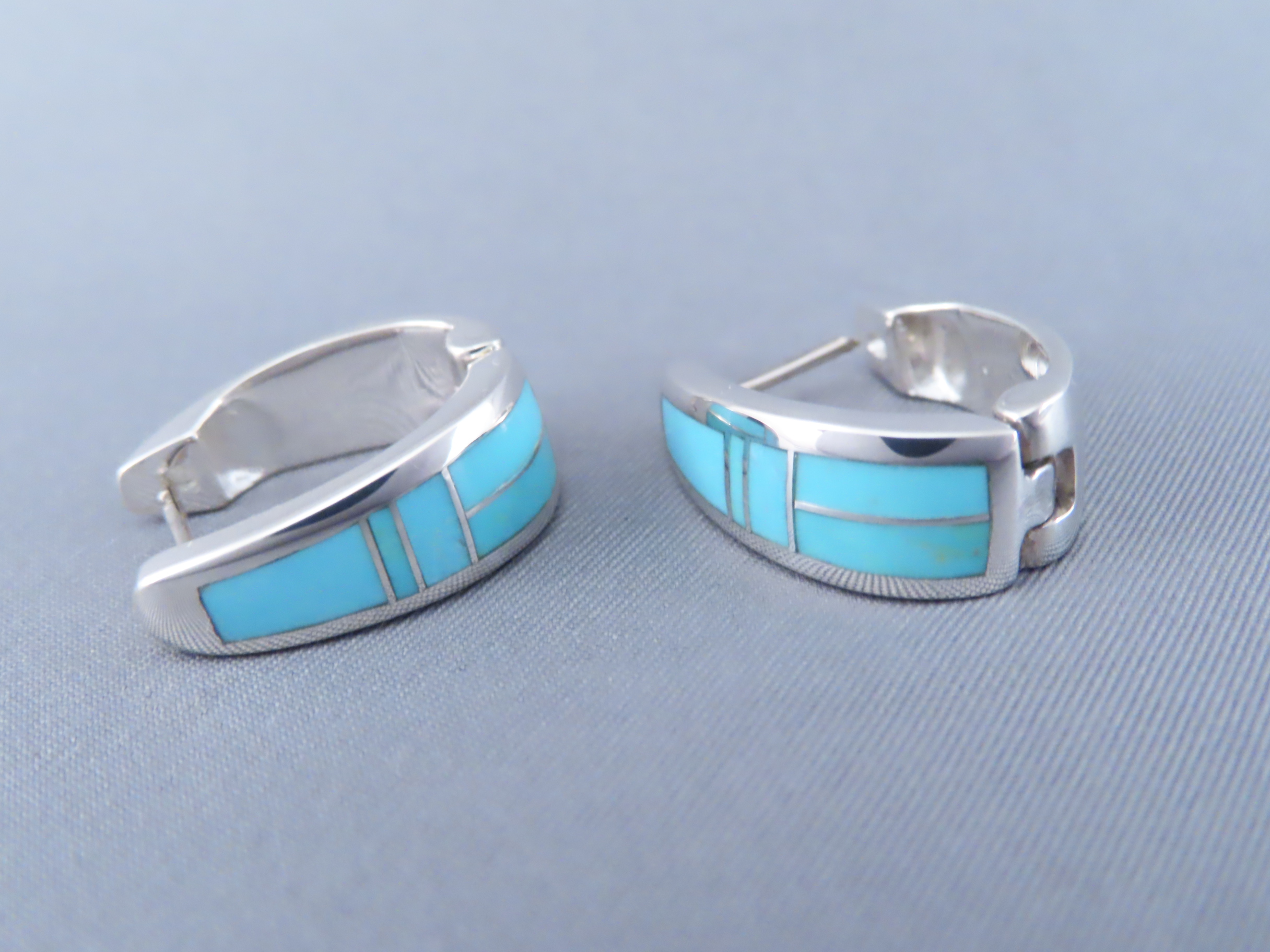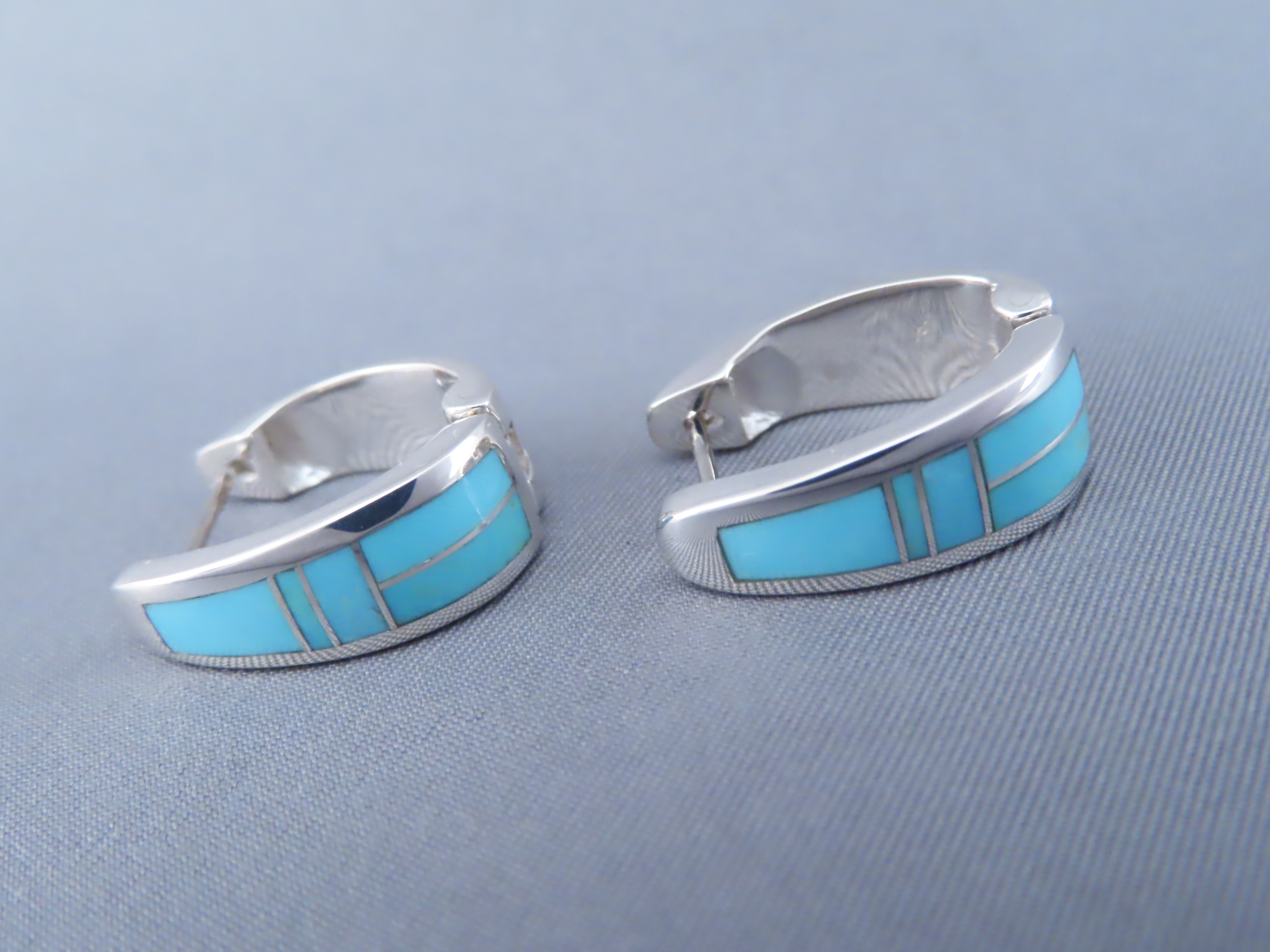 Turquoise Inlay Huggies! Sterling silver inlay lever back post earrings (huggies) featuring finely inlaid Turquoise stones. These lovely inlay earrings were beautifully made by Native American (Navajo) jewelry artist, Charles Willie.