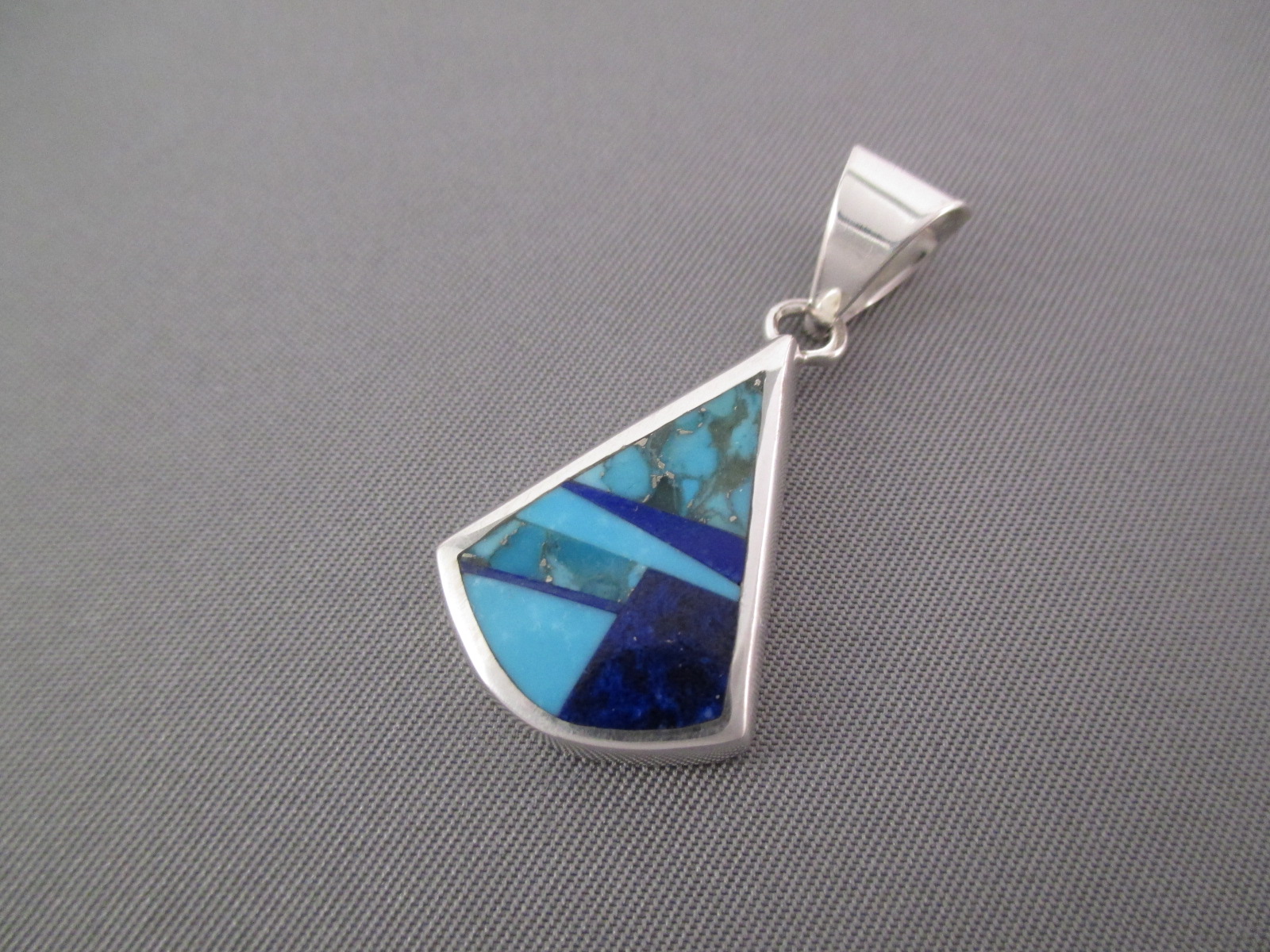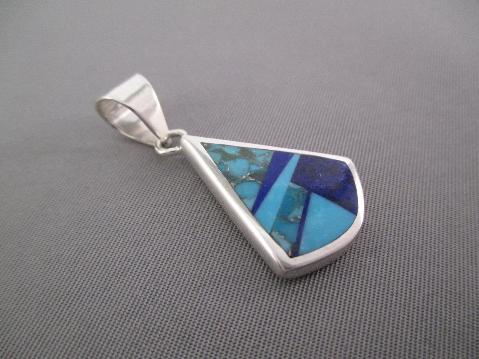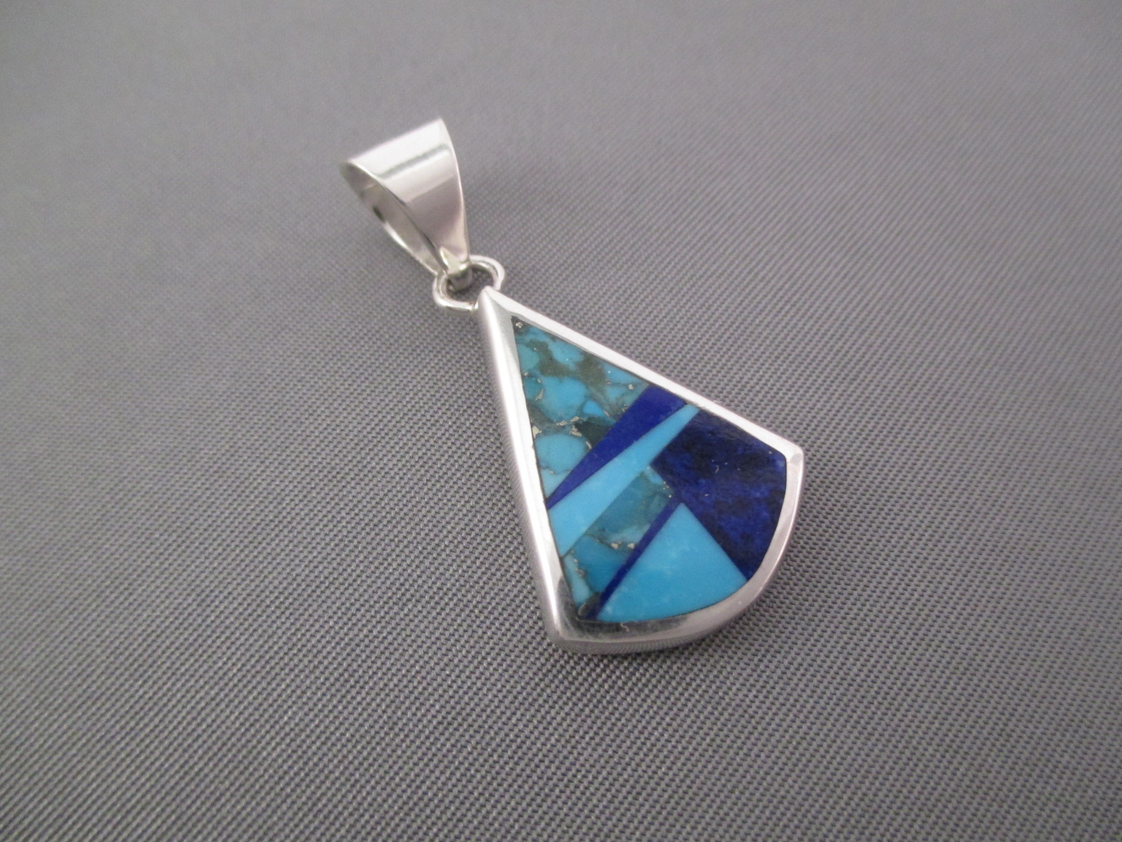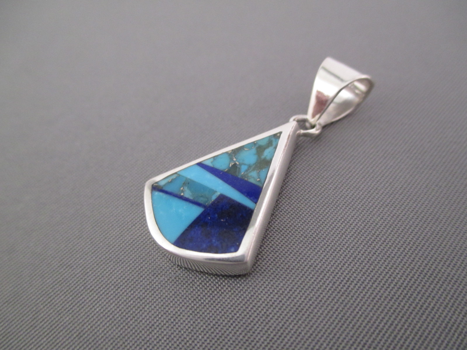 Turquoise & Lapis Inlay Pendant! Beautiful smaller sterling silver shield-shaped pendant with the LOVELY combination of Turquoise & Lapis inlay. Made by Native American (Navajo) jewelry artist, Charles Willie.