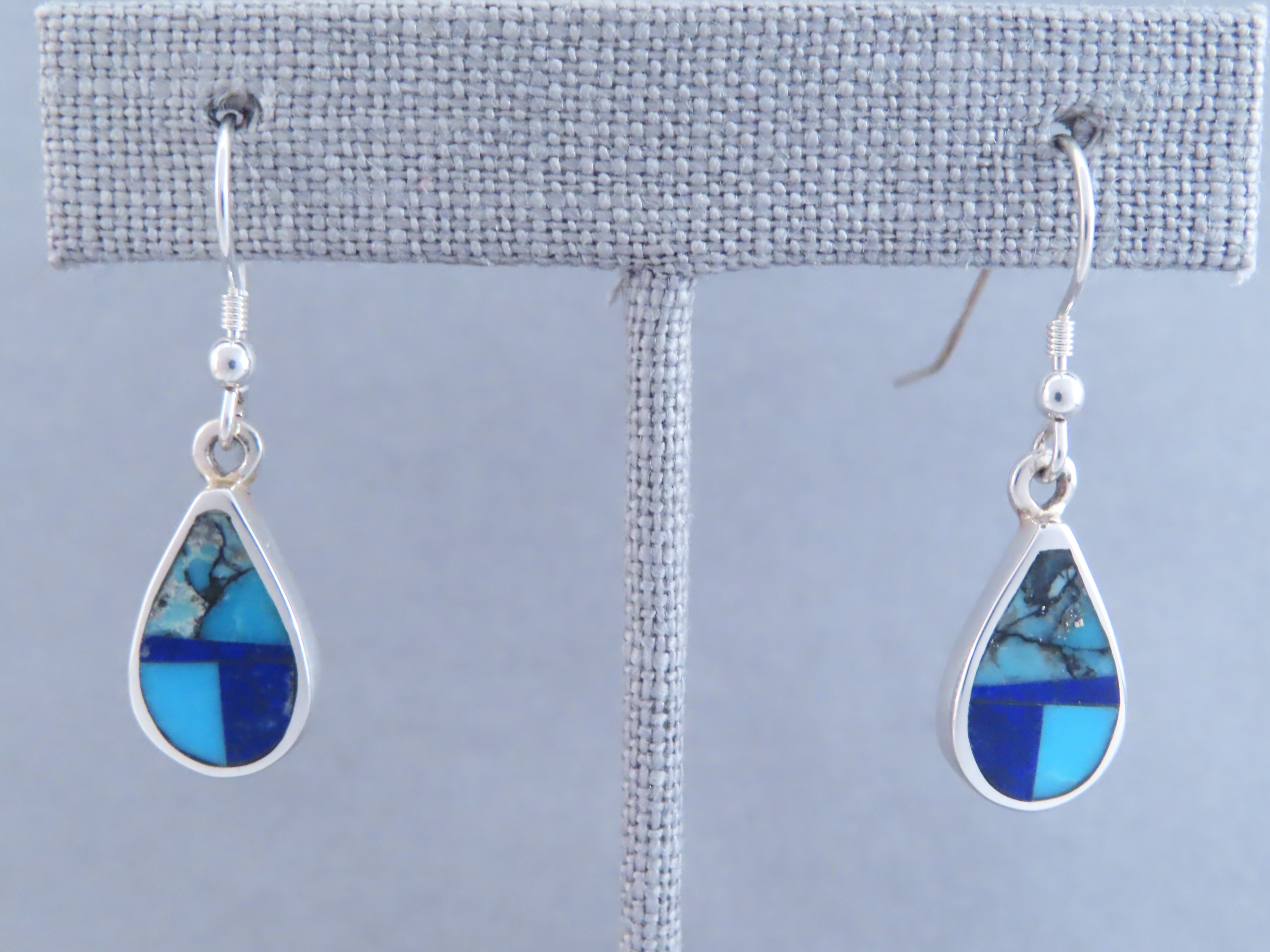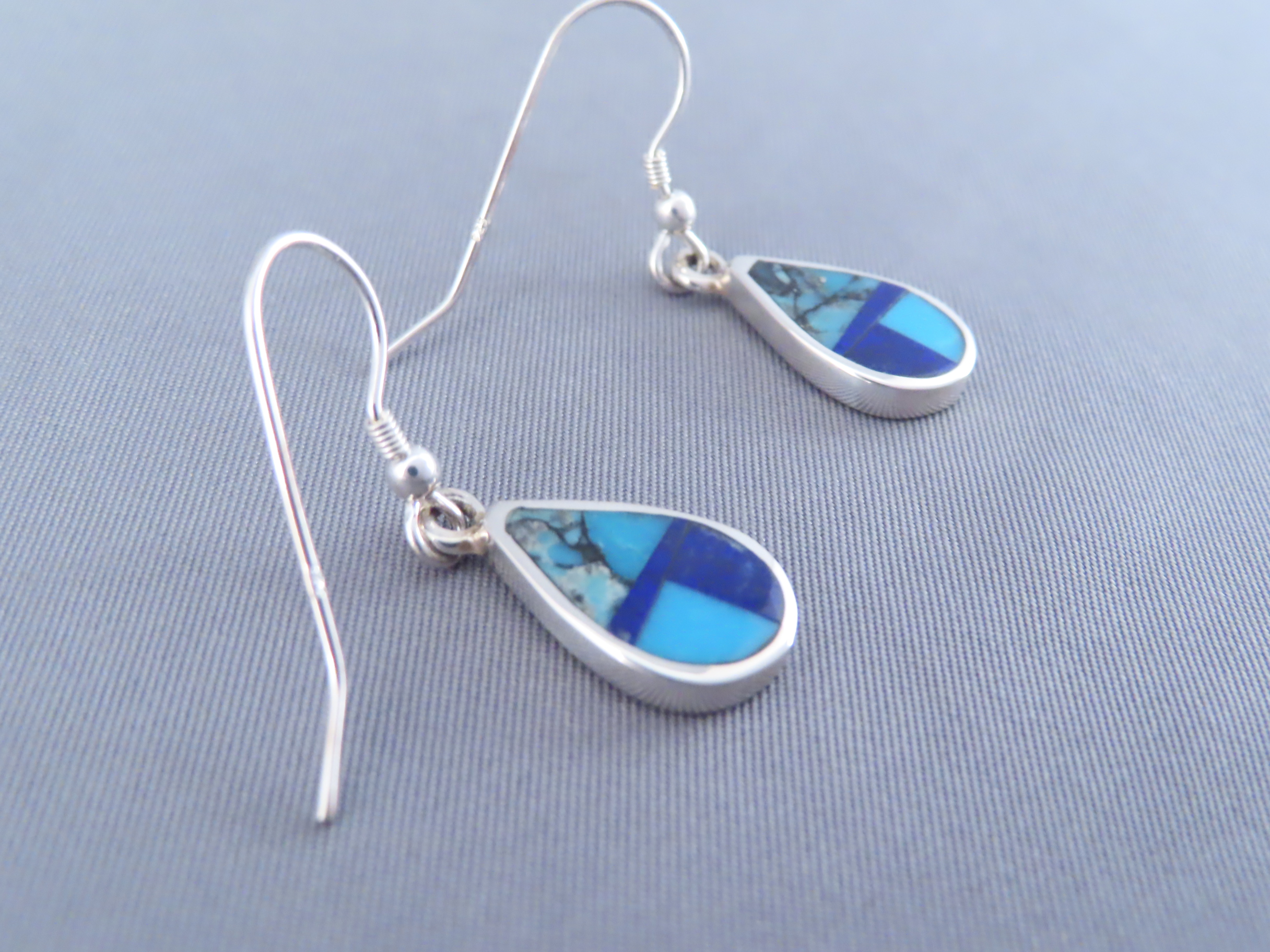 These beautiful sterling silver inlay ‘Teardrop’ shaped hook earrings feature precisely inlaid Turquoise and Lapis stones. Made by Navajo jewelry artist, Tim Charlie. Two different kinds of turquoise mixed with the lapis – A blue/green inlay beauty set!