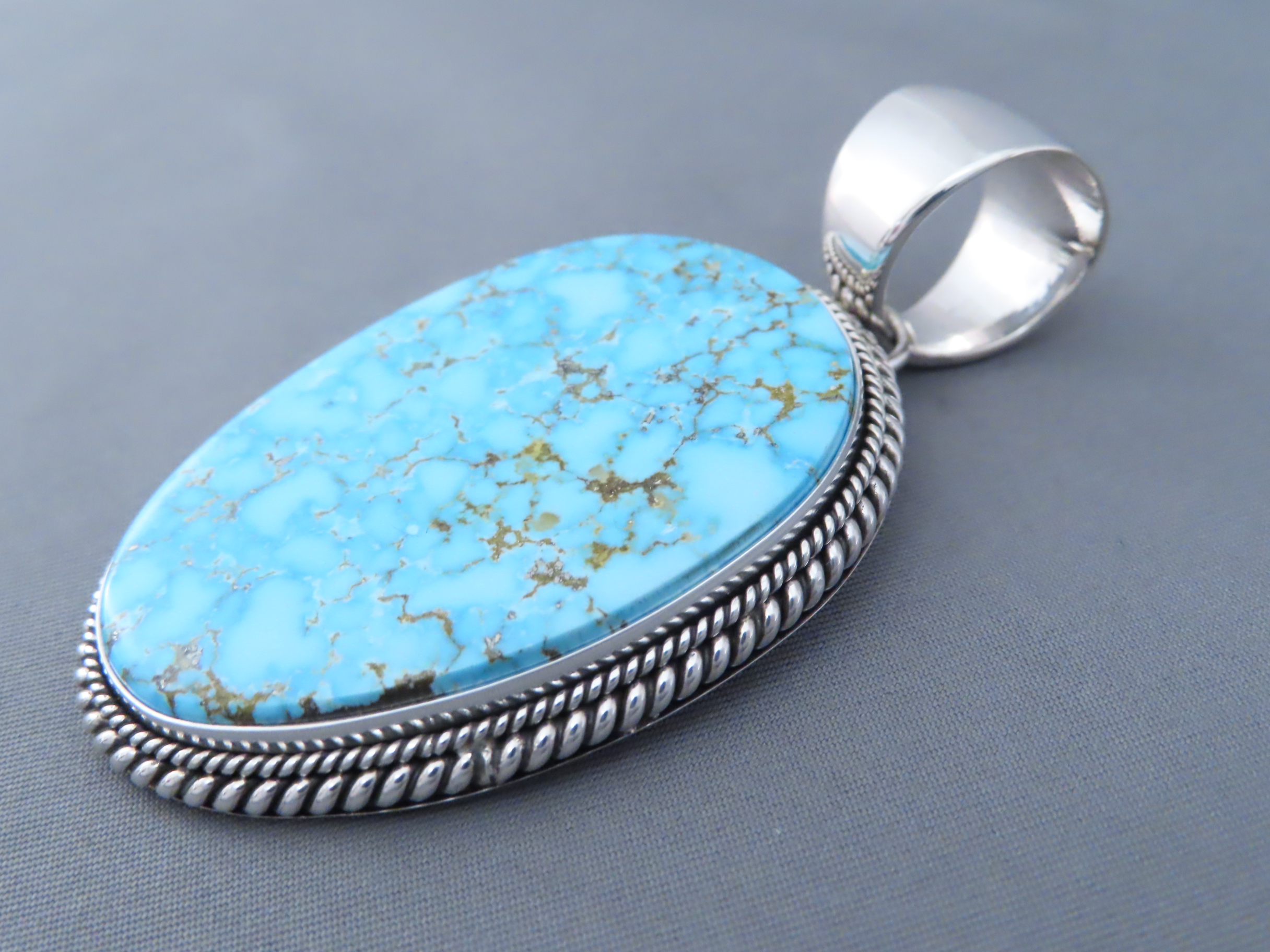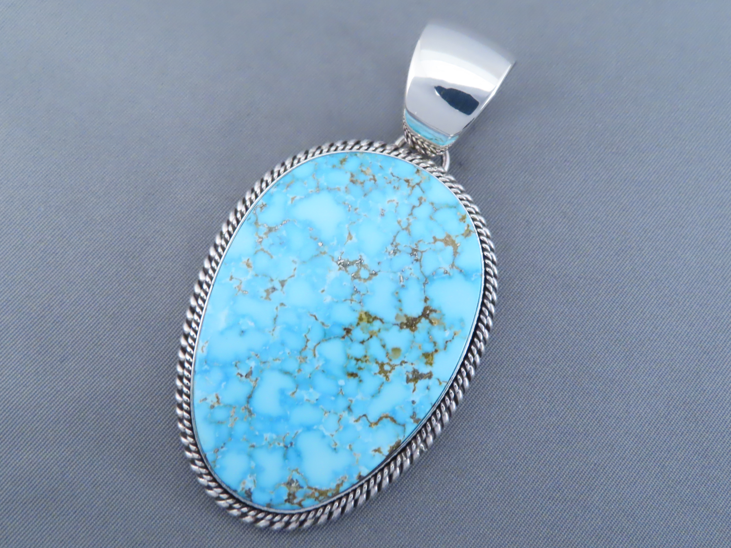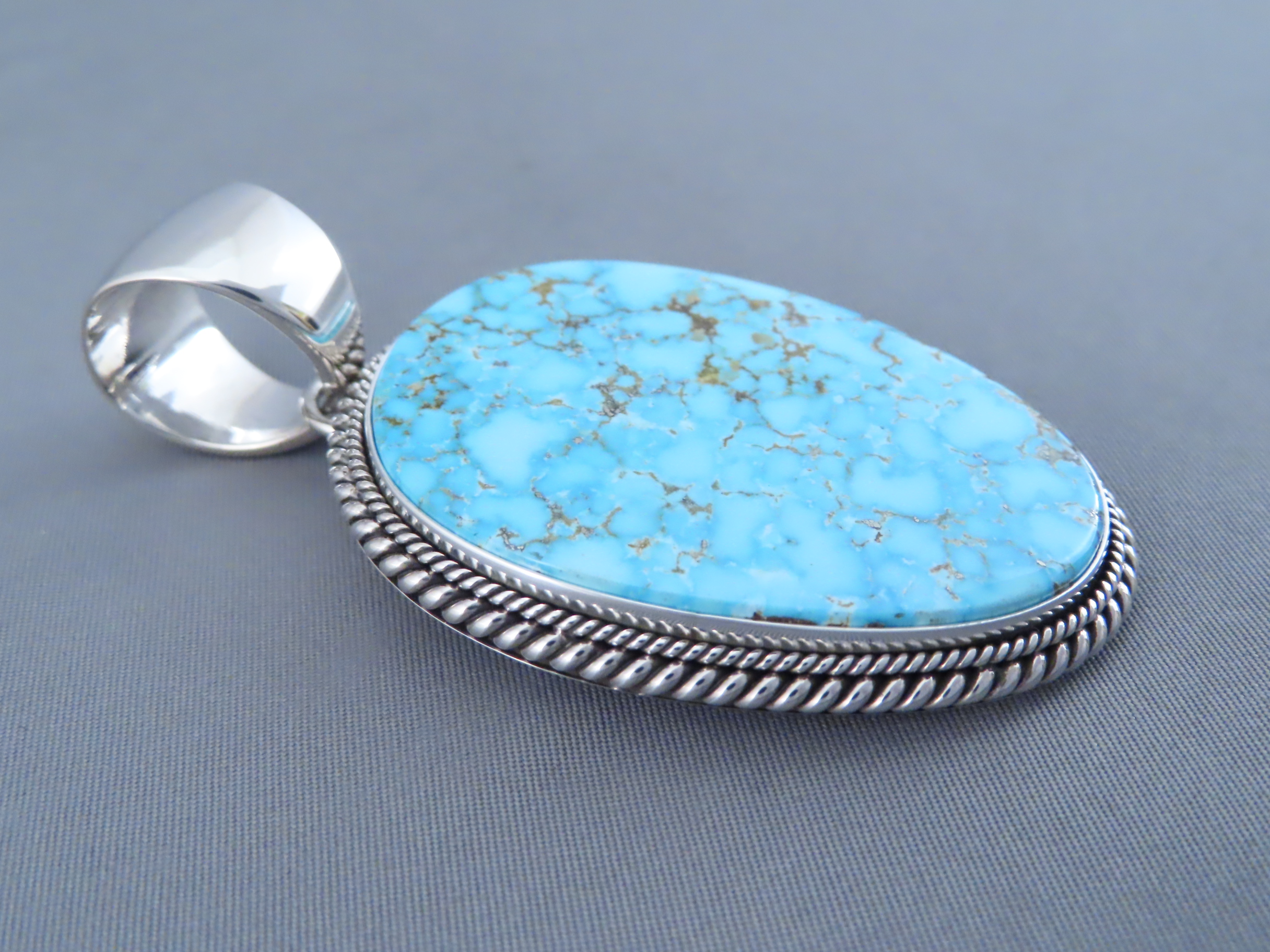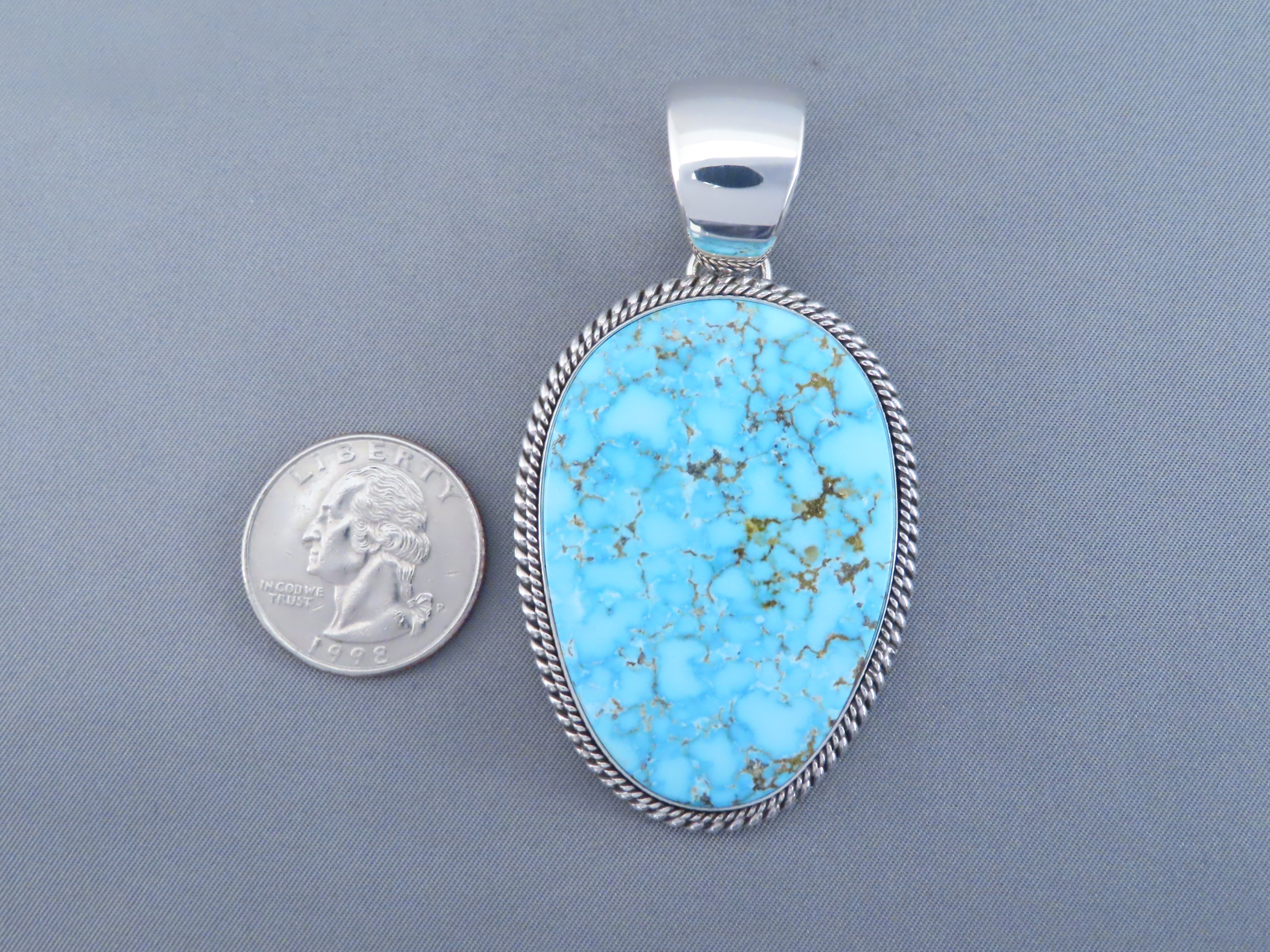 Kingman Turquoise Pendant! Navajo jewelry artist, Artie Yellowhorse, made this large and very attractive oval Kingman Turquoise pendant. Beautiful Native American Turquoise Jewelry!