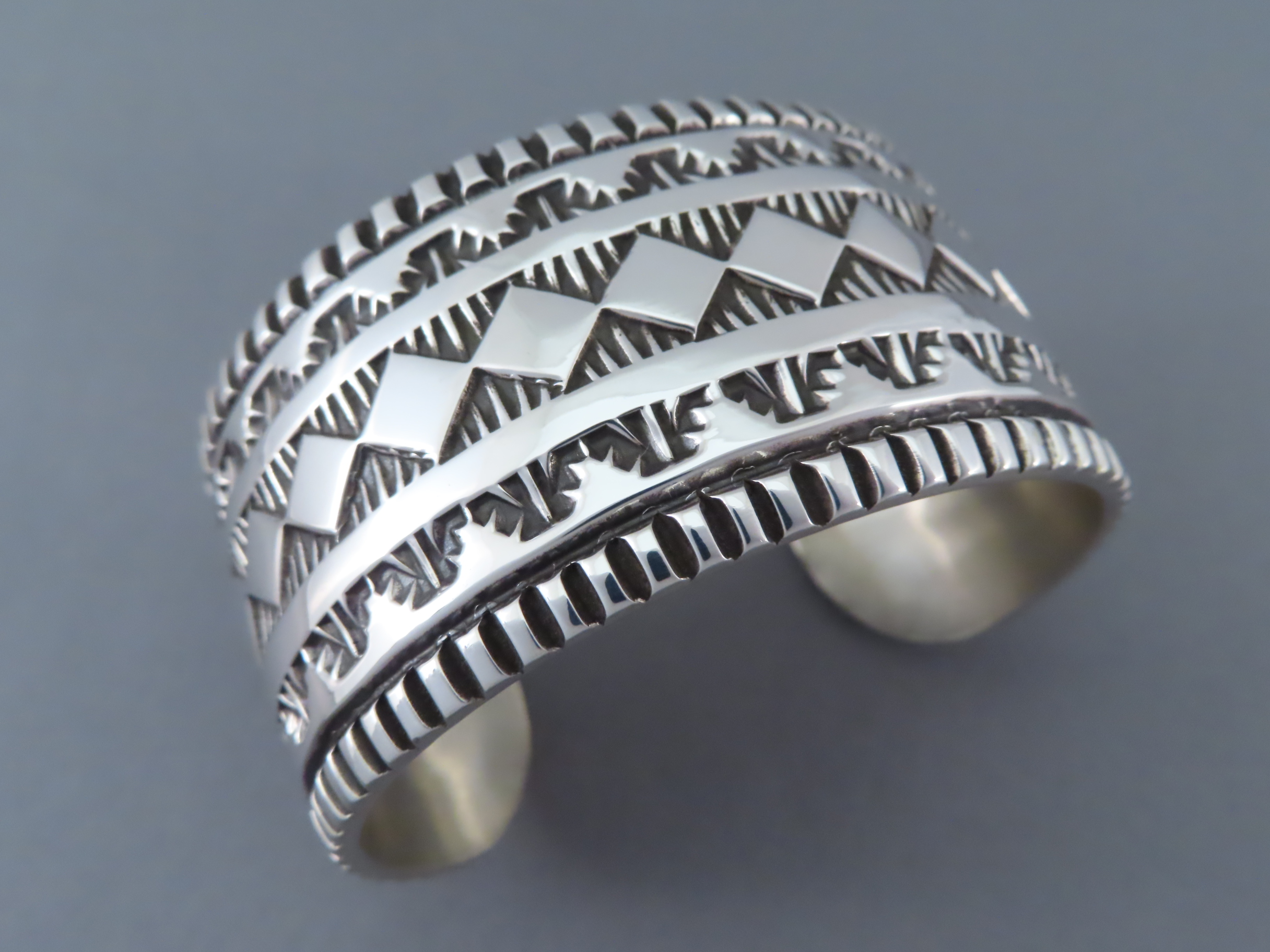 Wide Stamped Sterling Silver Cuff Bracelet! Native American jewelry artist, Elvira Bill (Navajo), created this unique wide sterling silver cuff bracelet for a larger -sized wrist. Attractive design!